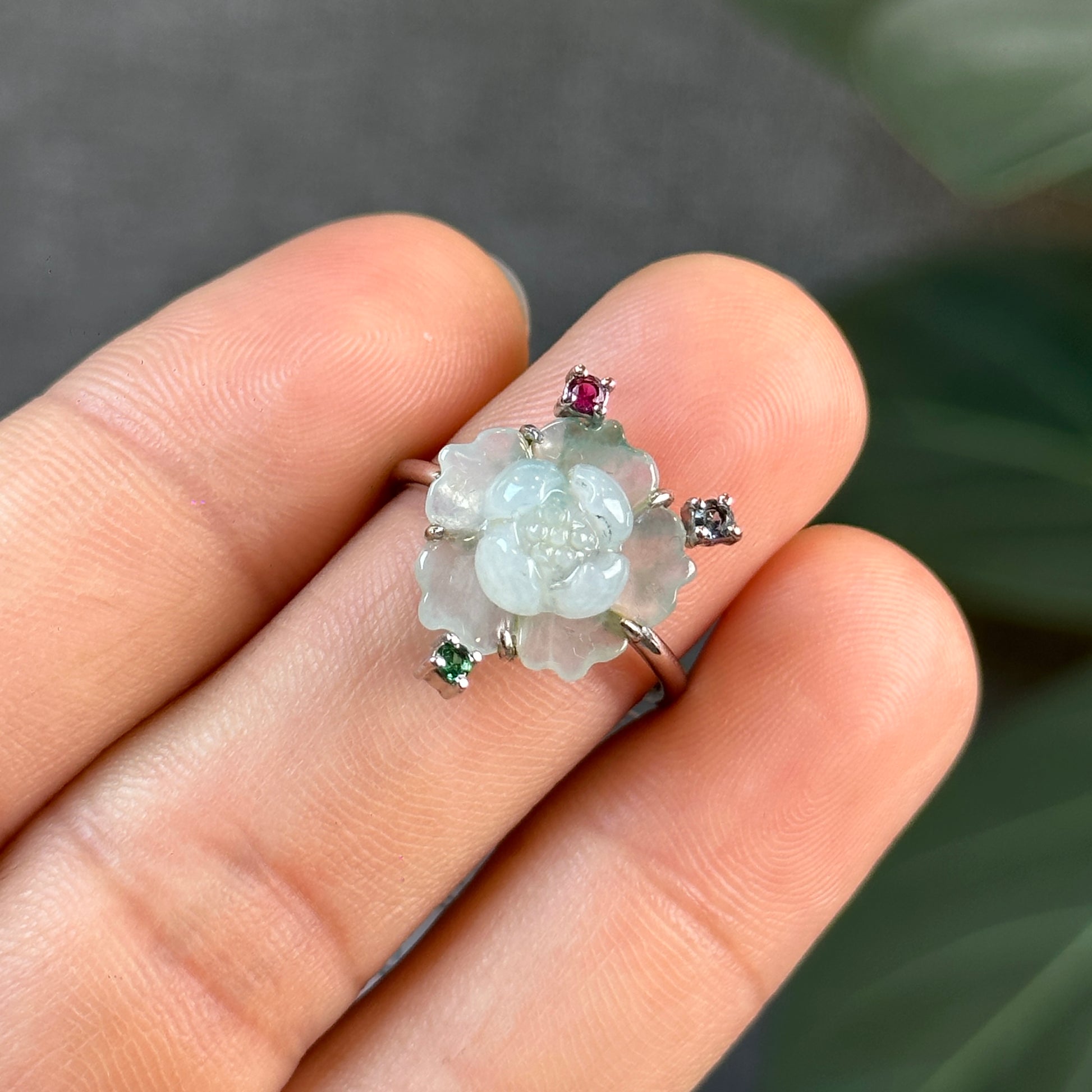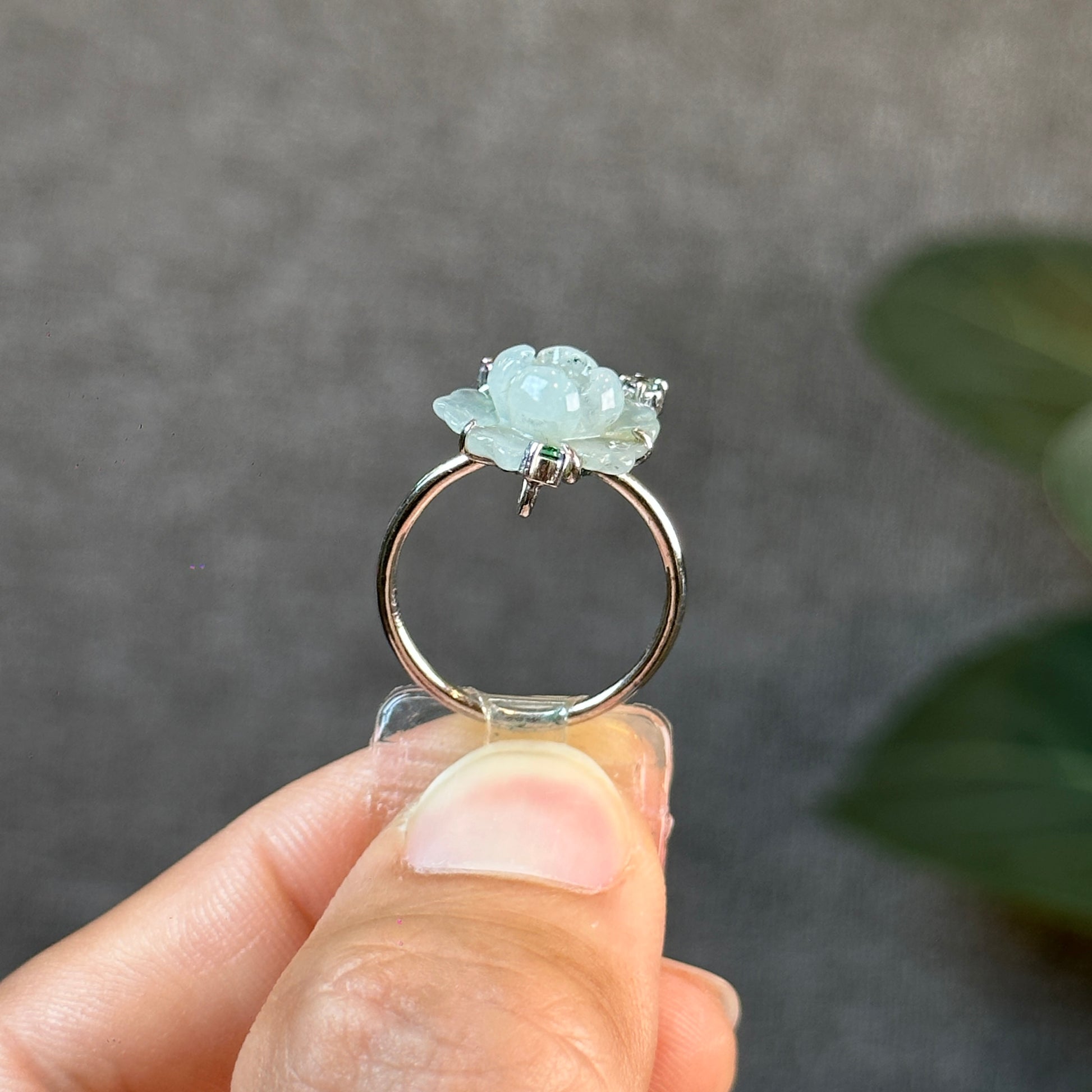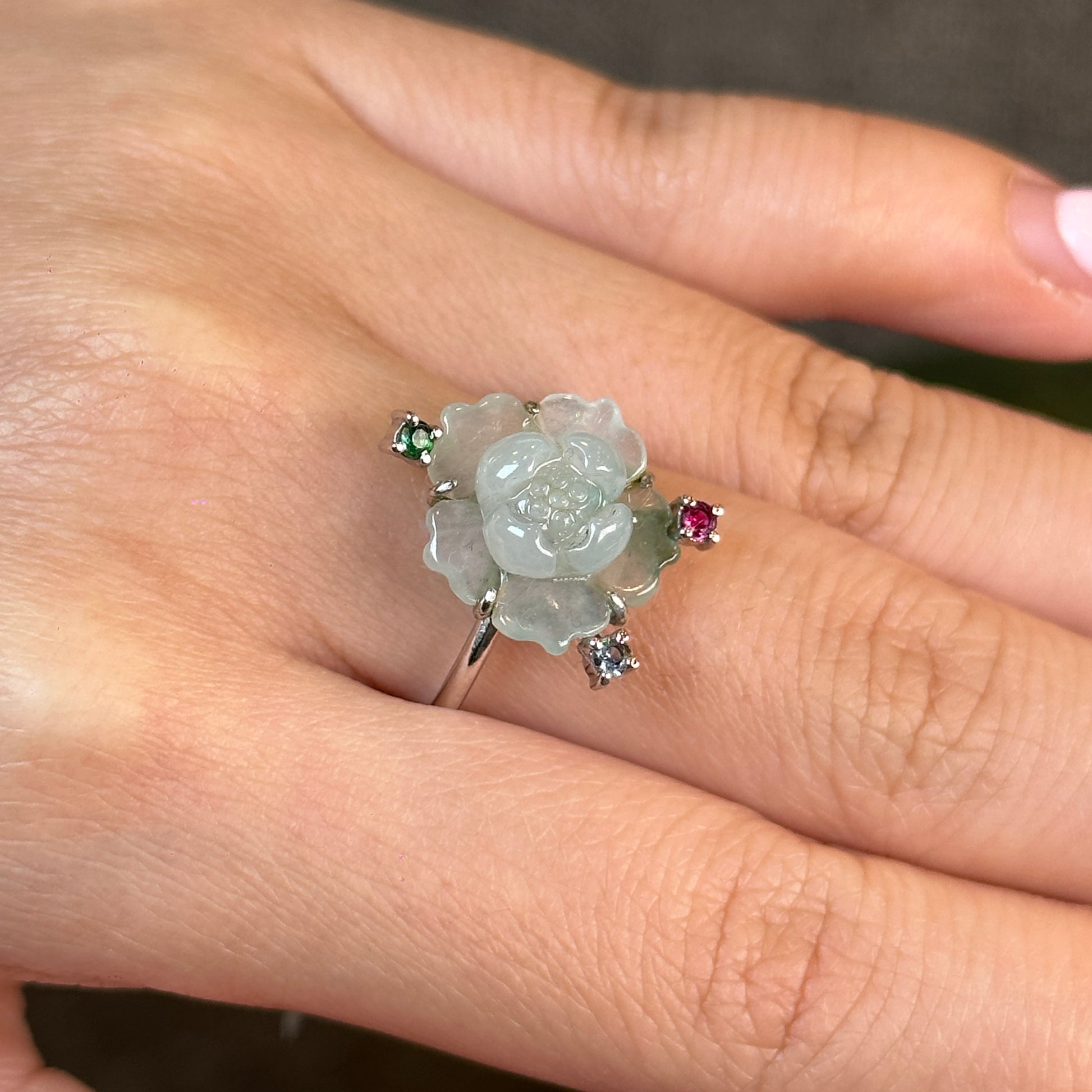 Bague fleur de lotus en jadeite vert d'eau, style pierre tricolore, en or blanc 10 carats, taille 1,7