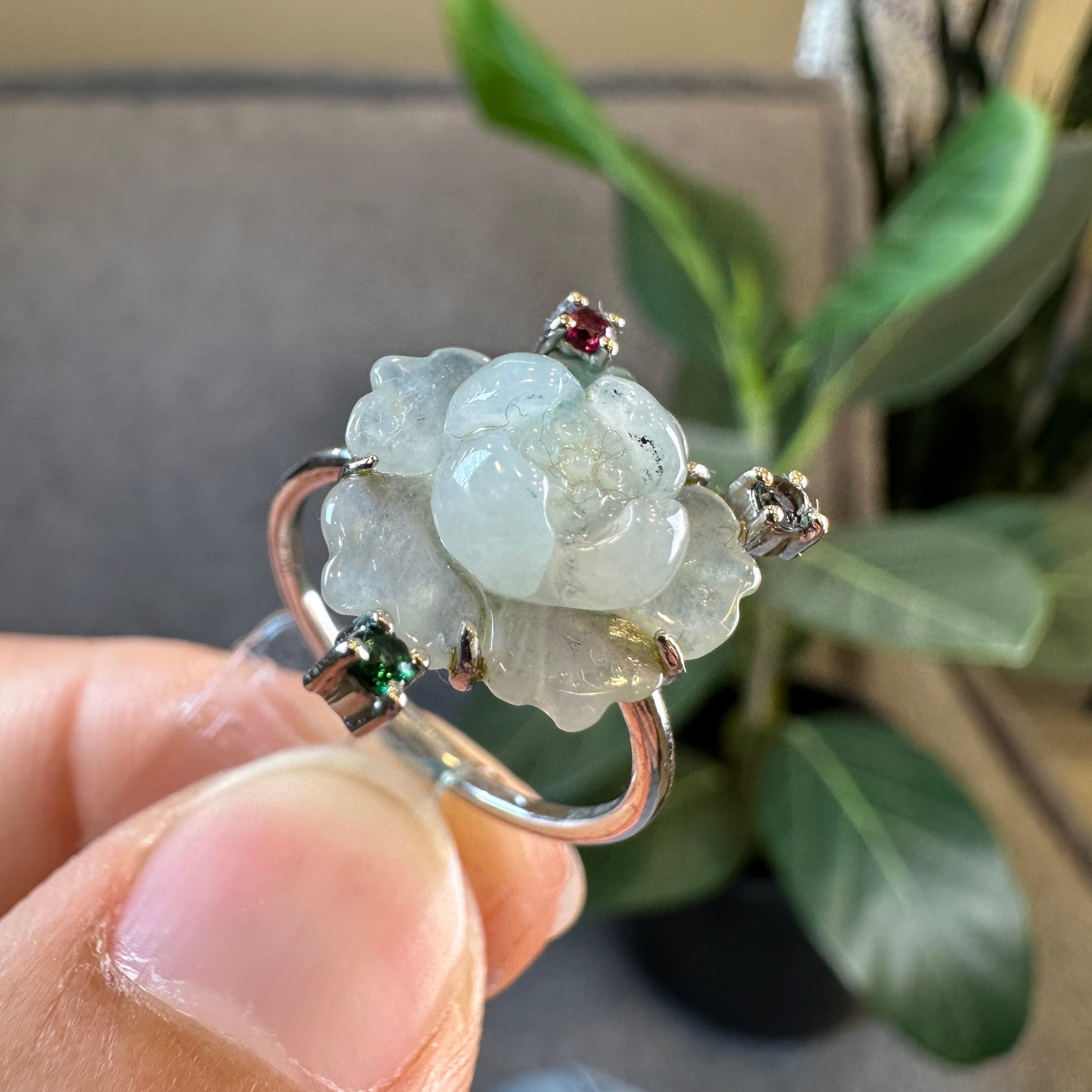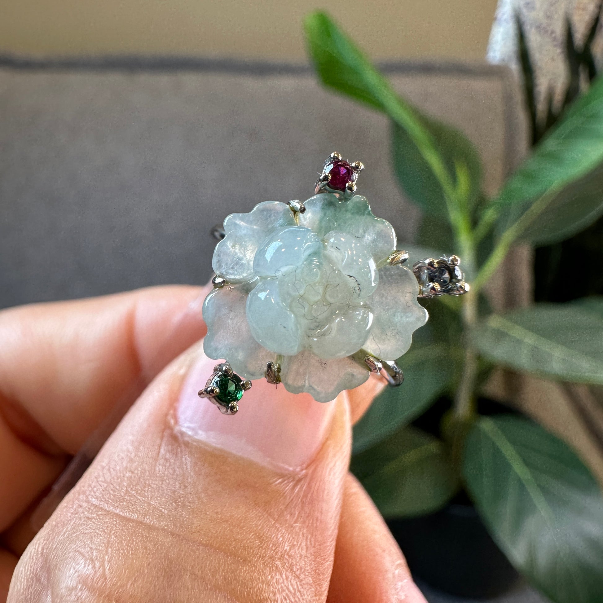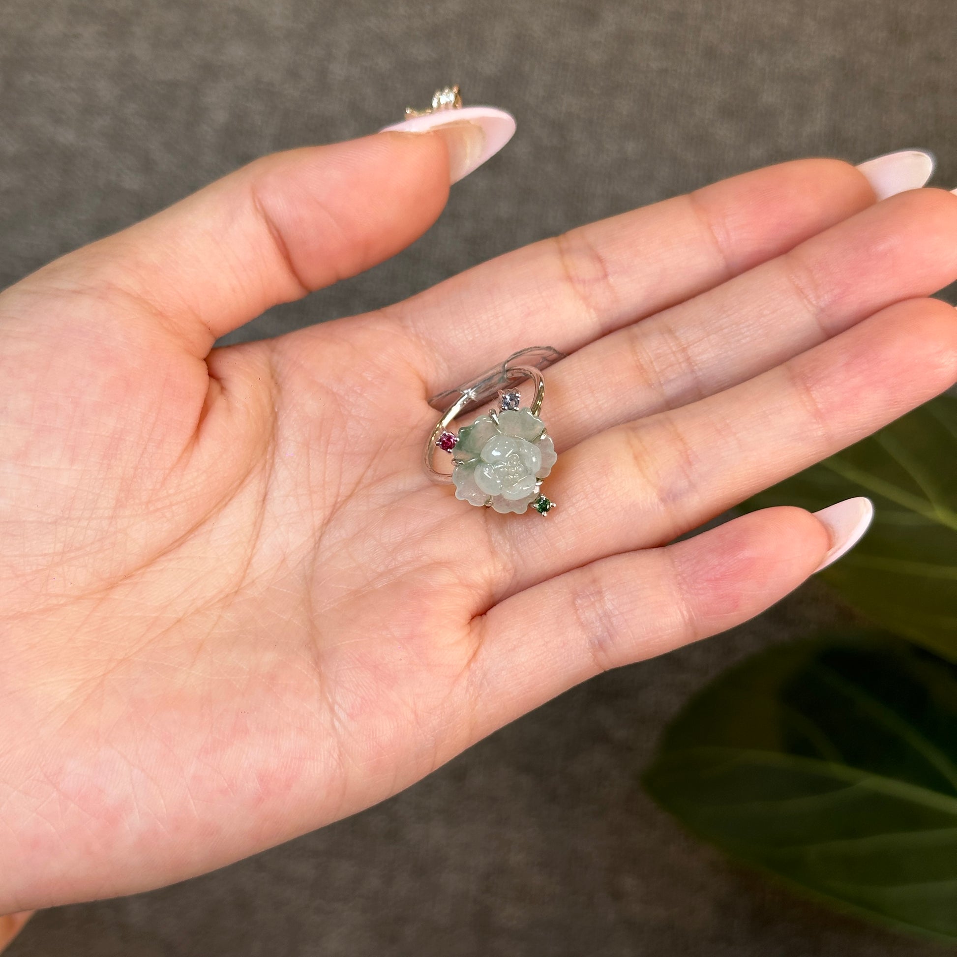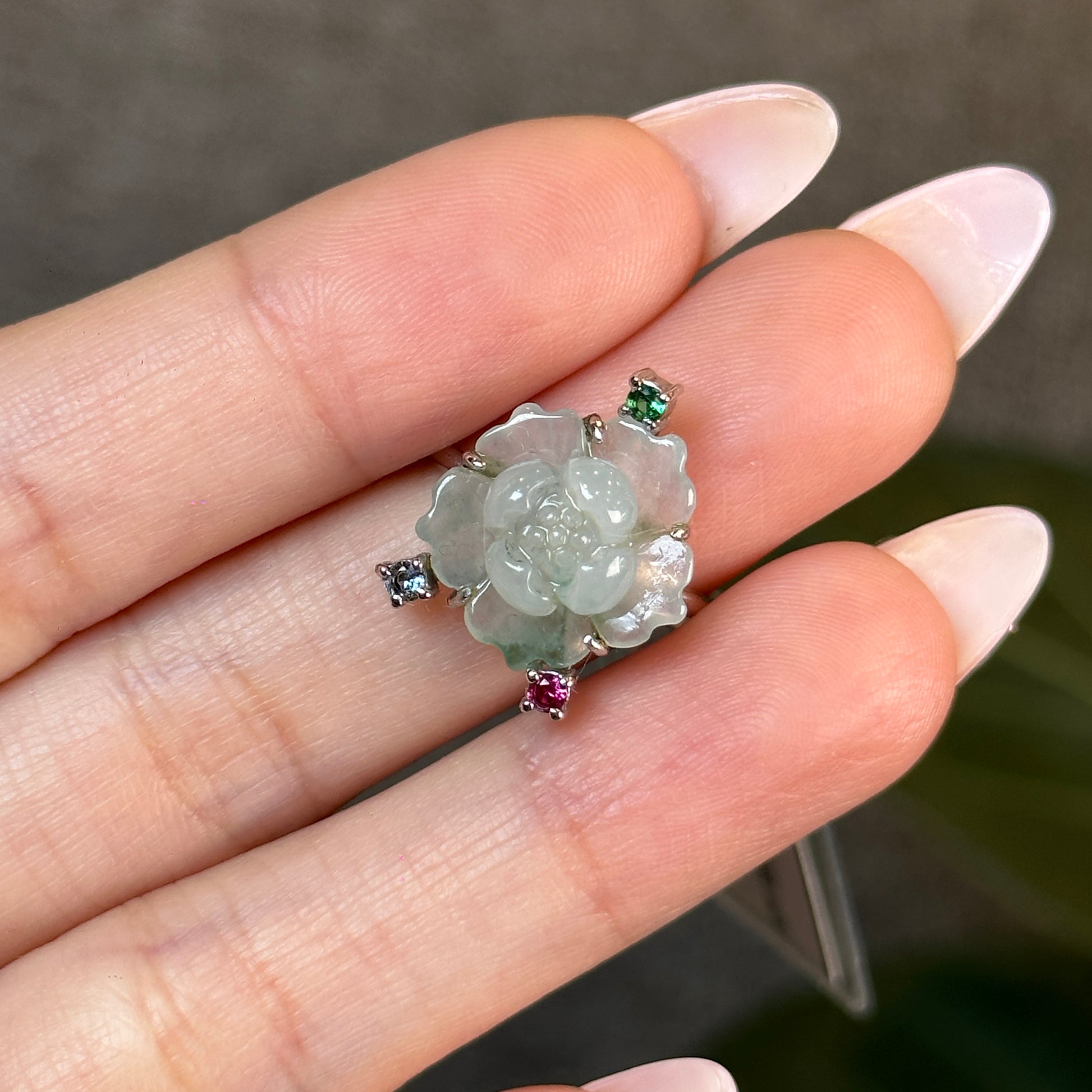 Bague fleur de lotus en jadeite vert d'eau, style pierre tricolore, en or blanc 10 carats, taille 1,7