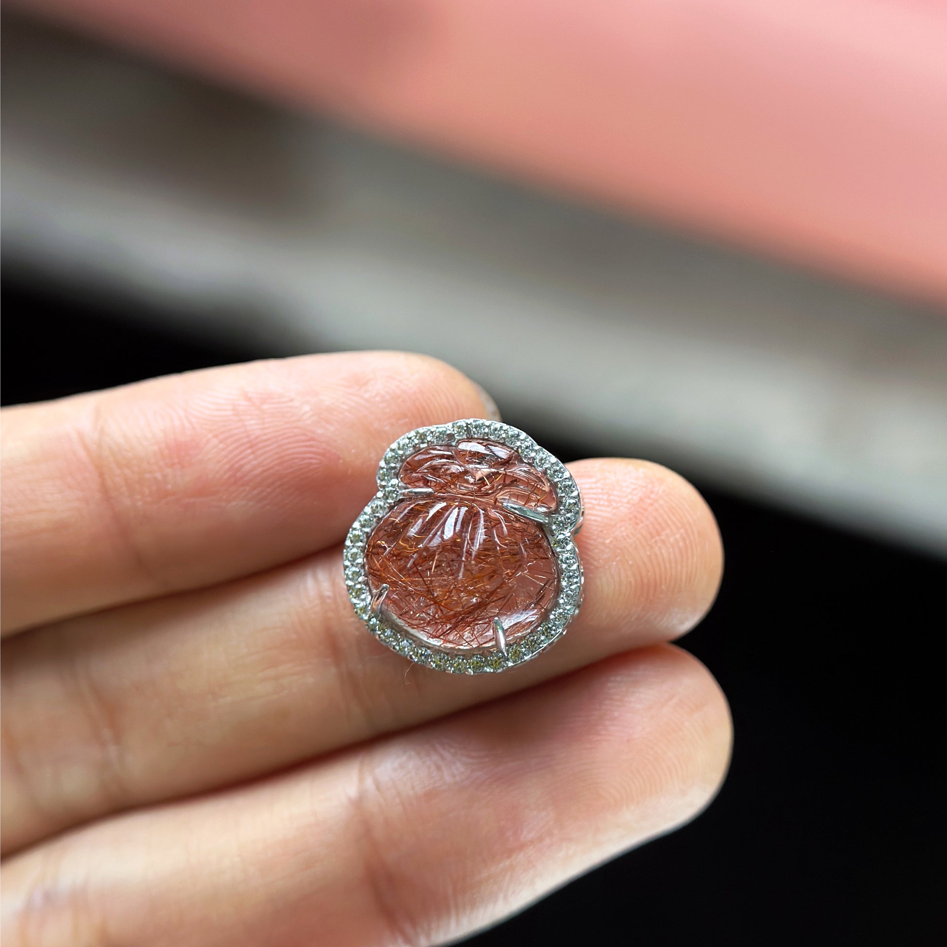 Money Bag Natural Red Rutilated Quartz Charm in Silver Setting with White Stones