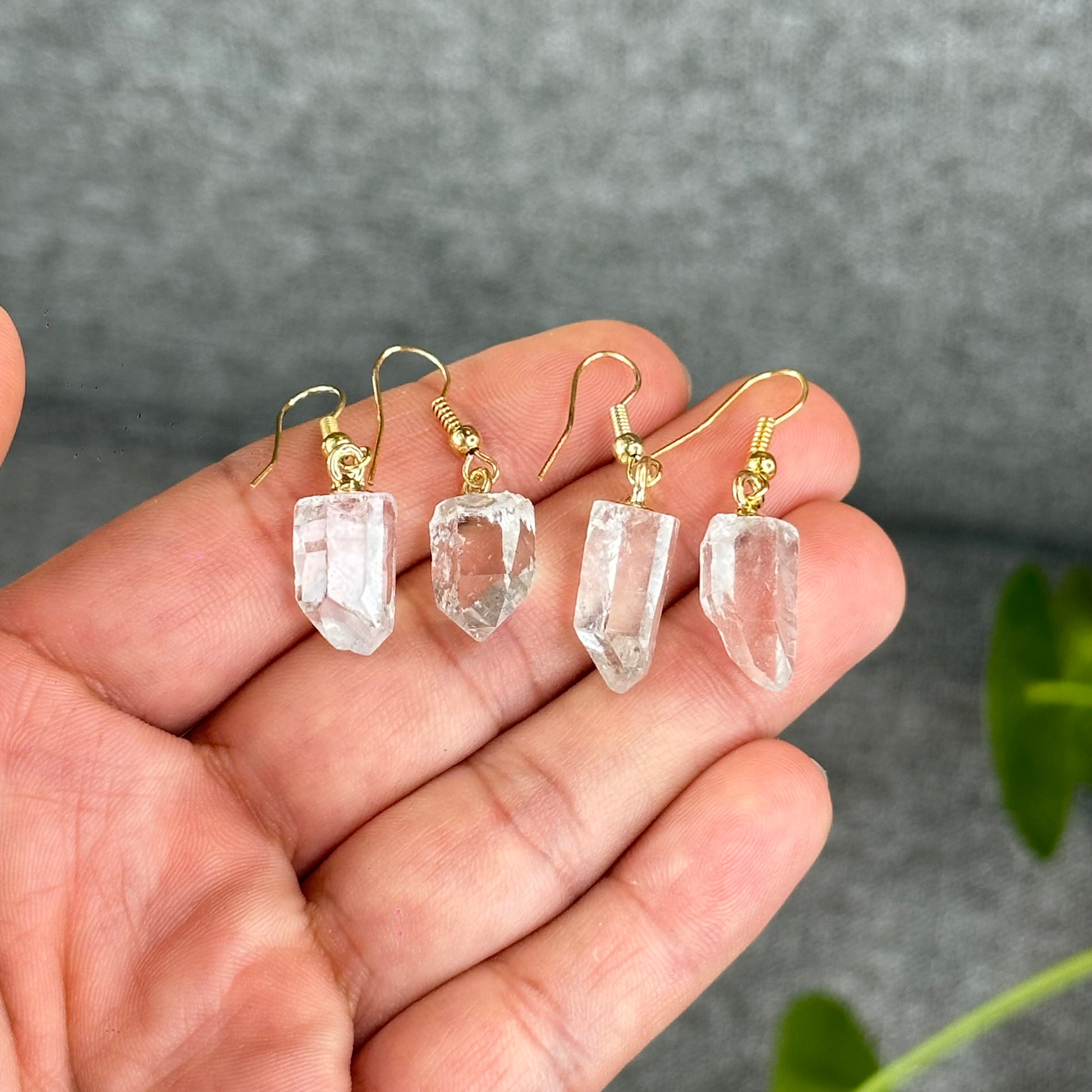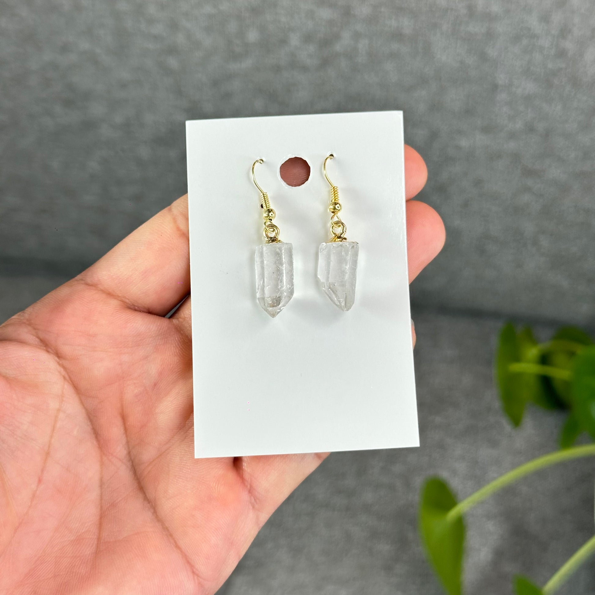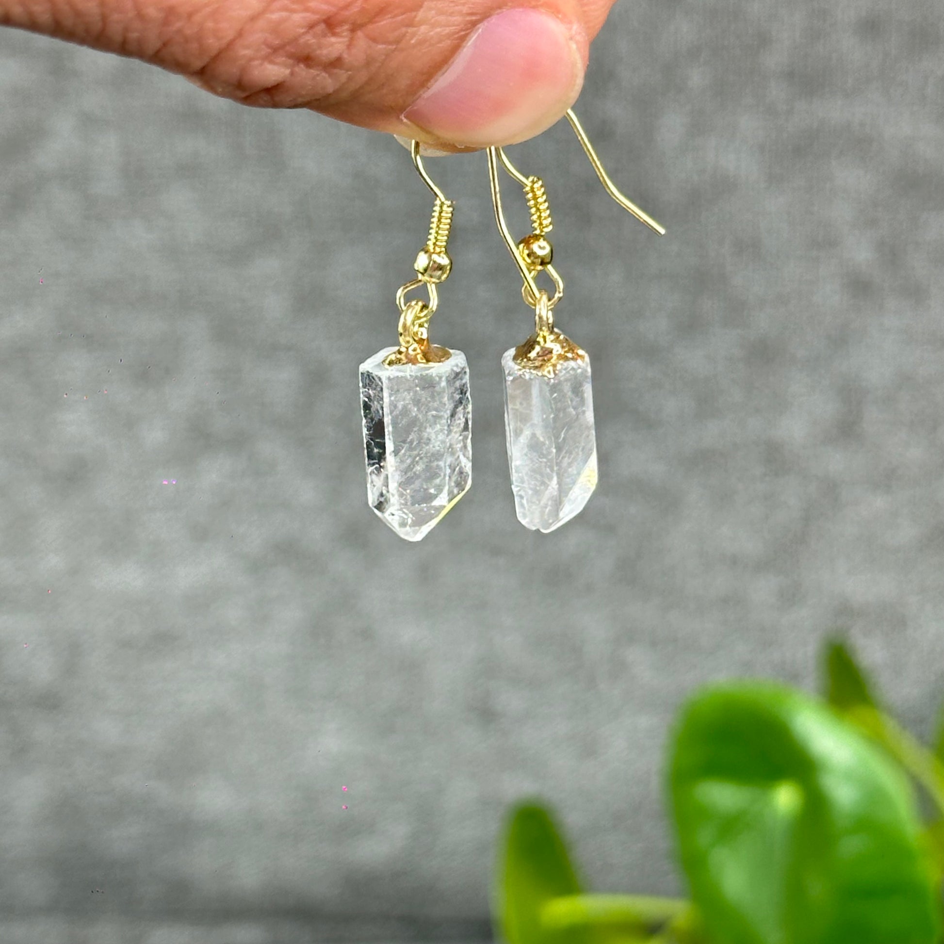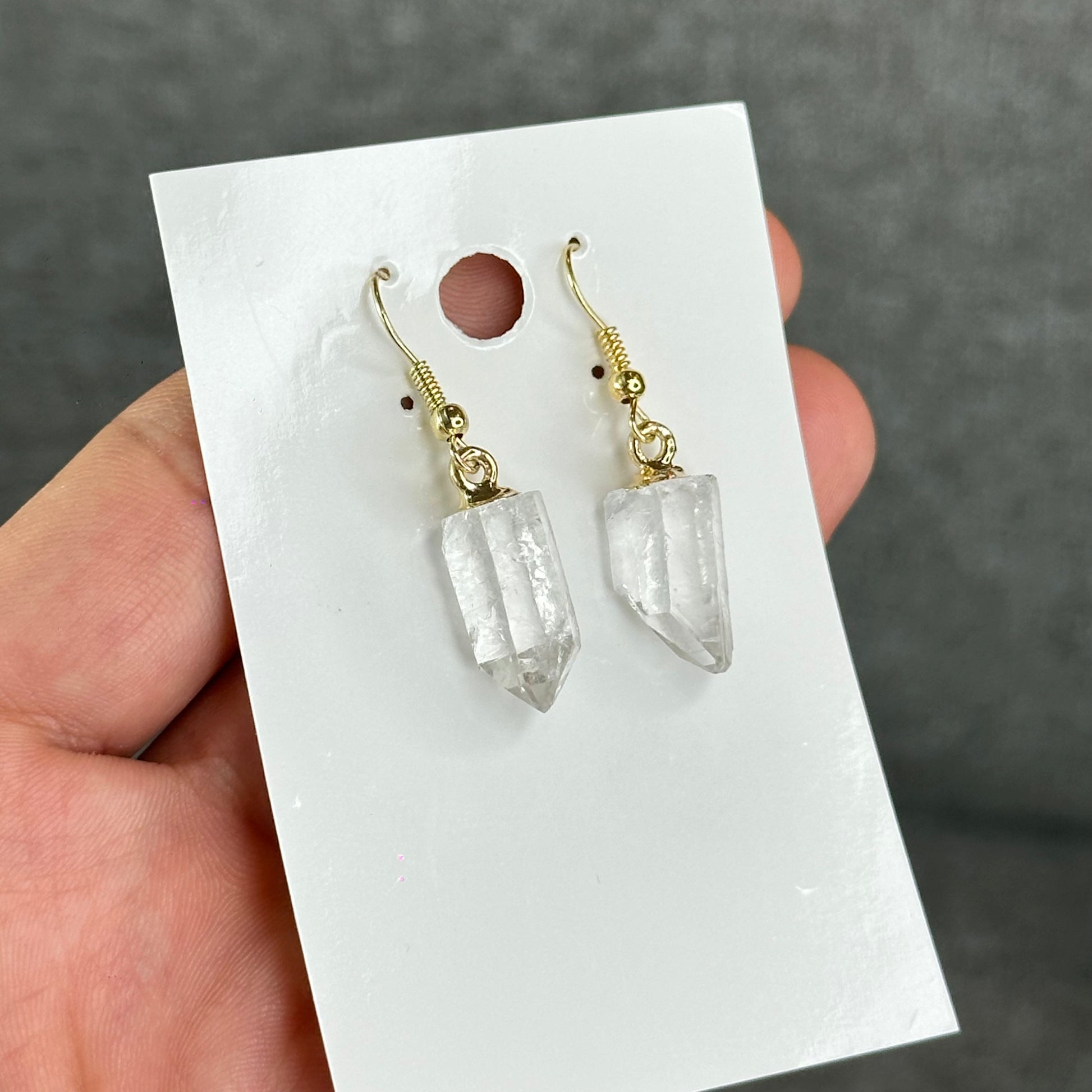 - Natural Clear Quartz Point Crystal Earrings Gold Platted
