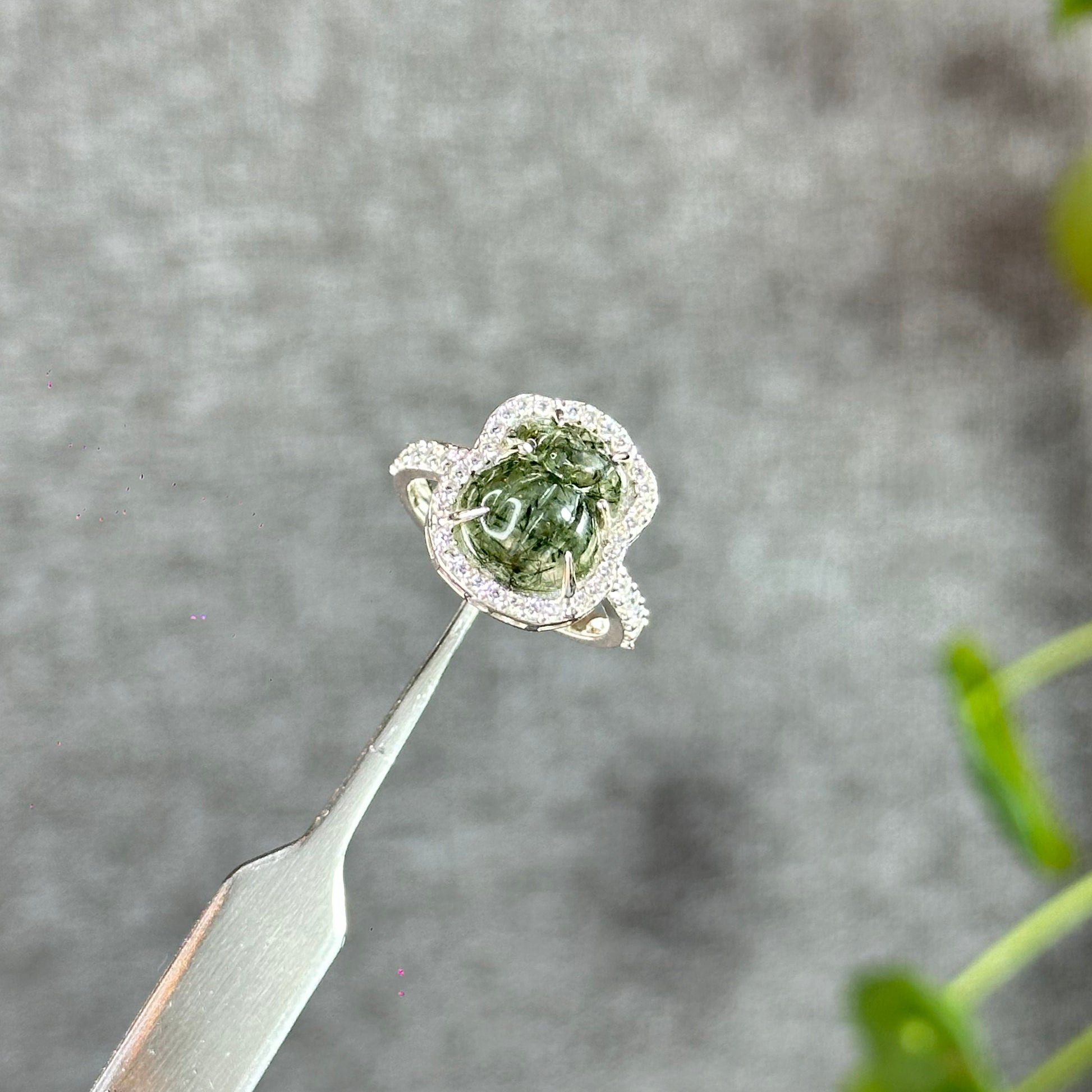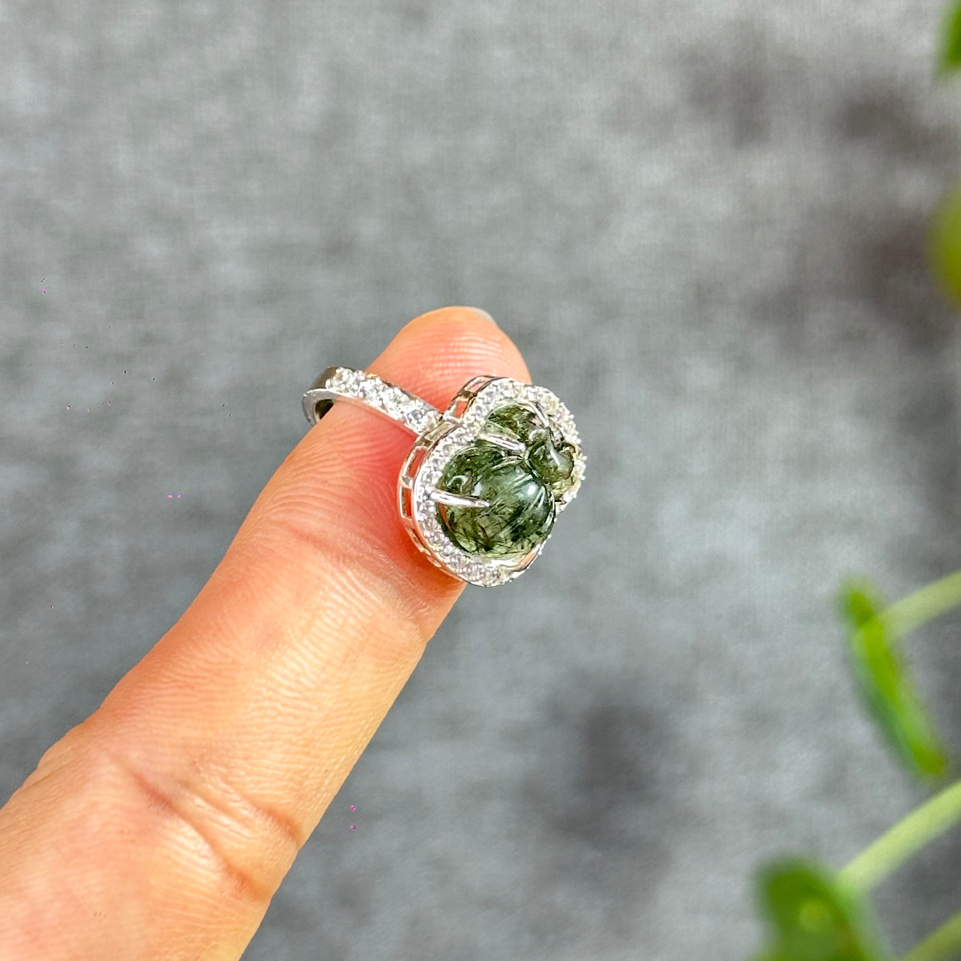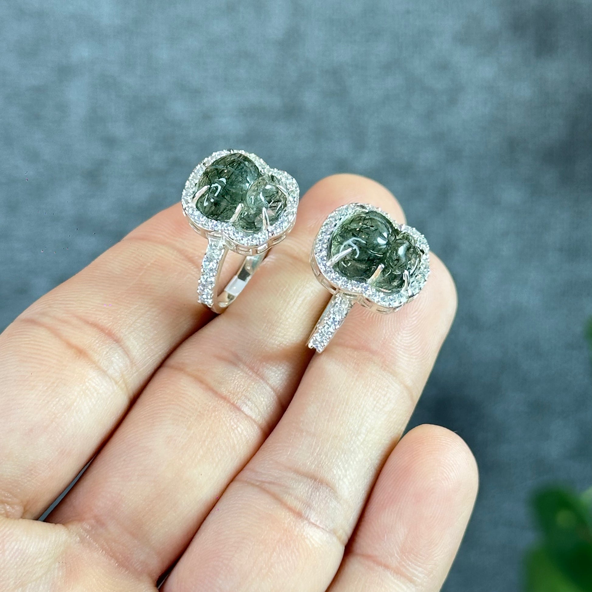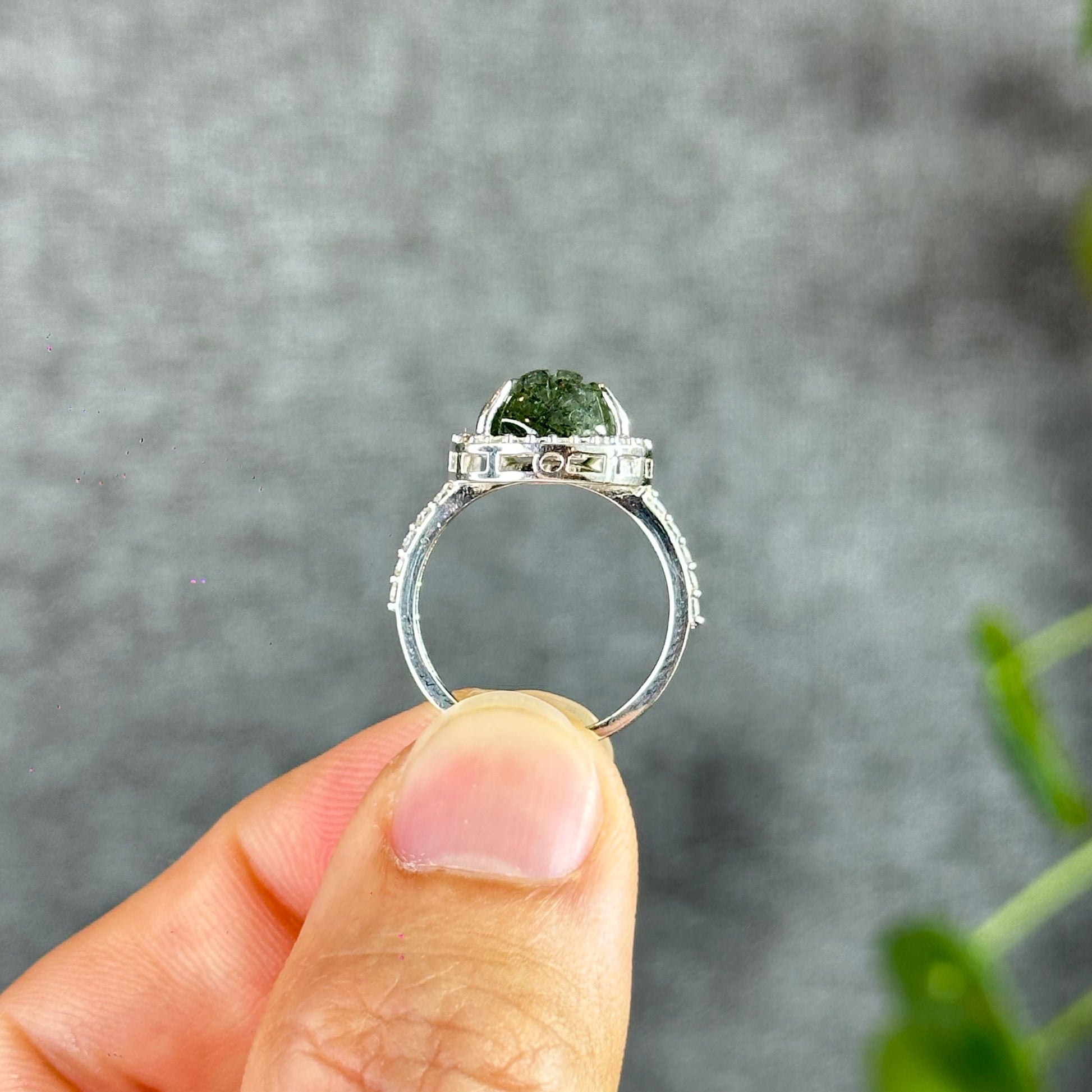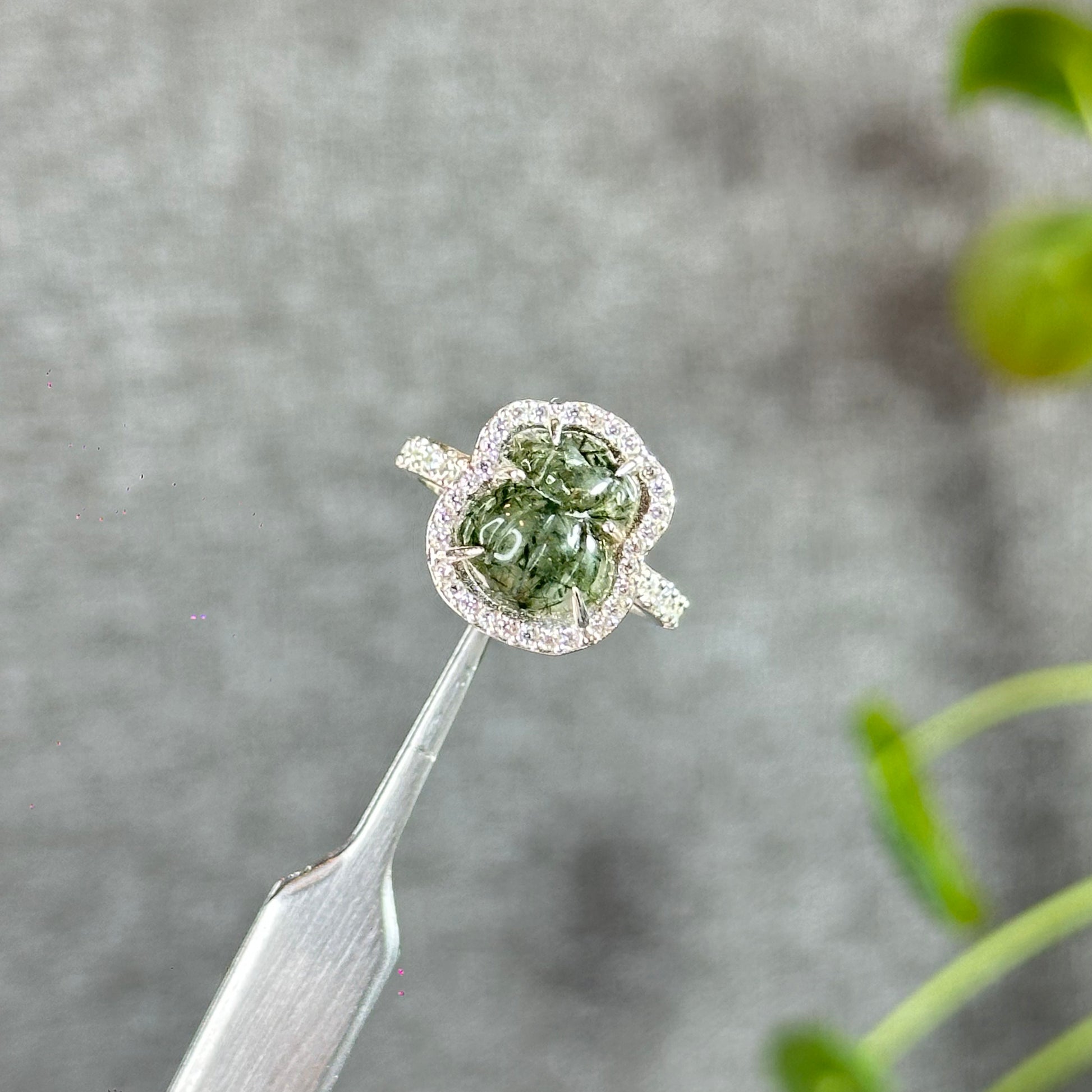 - Natural Green Rutilated Quartz Money Bag Ring in Silver with White Stone Setting Size 1.65