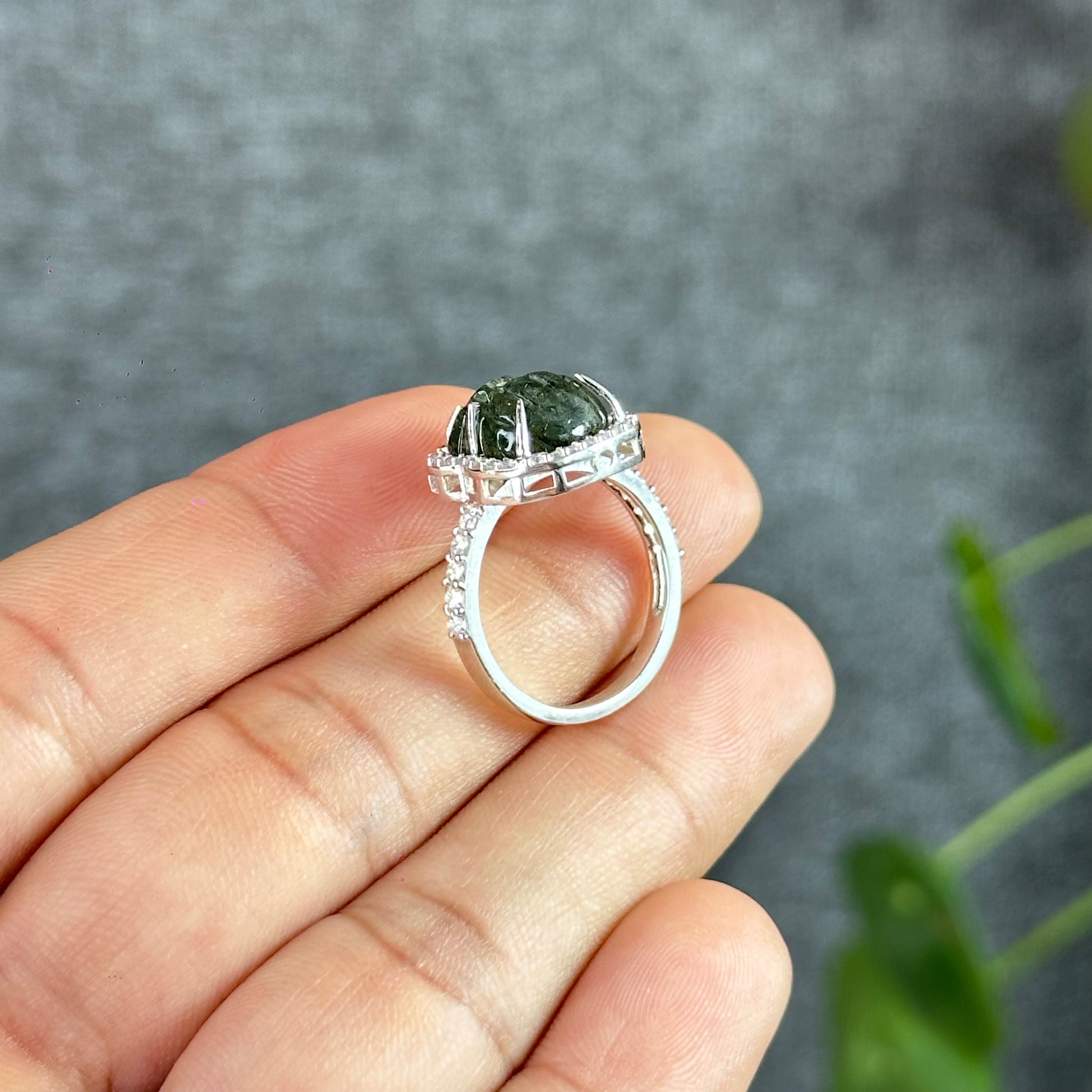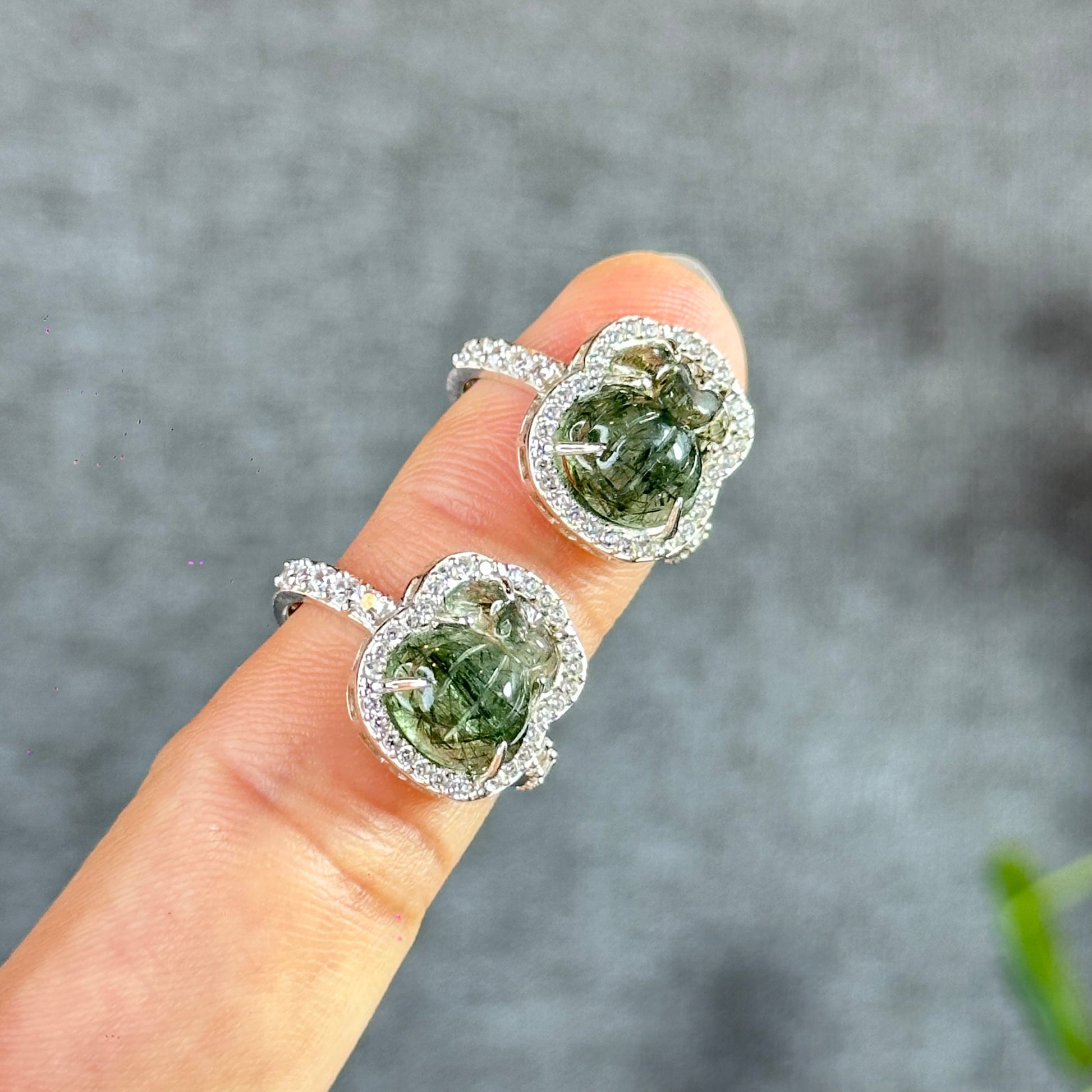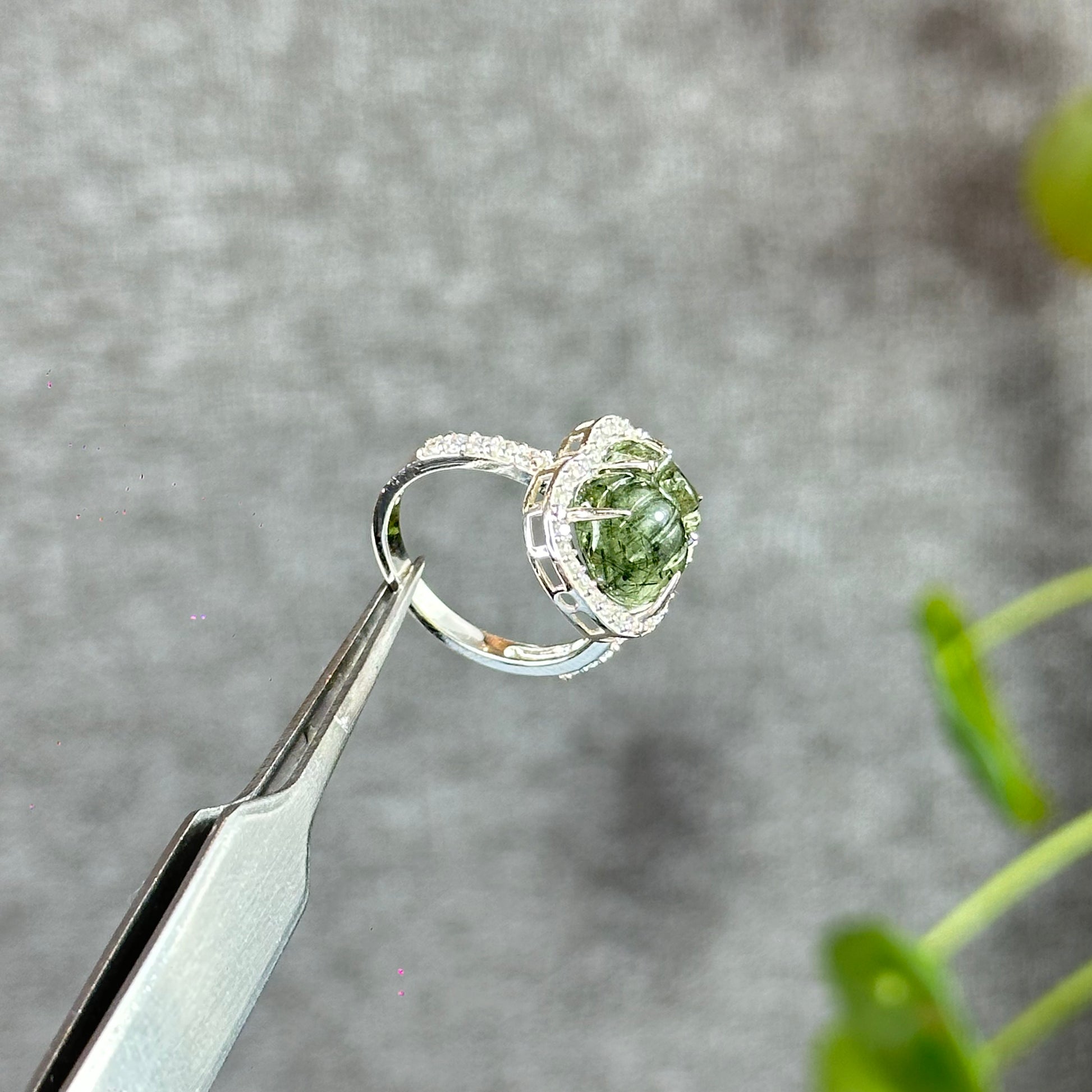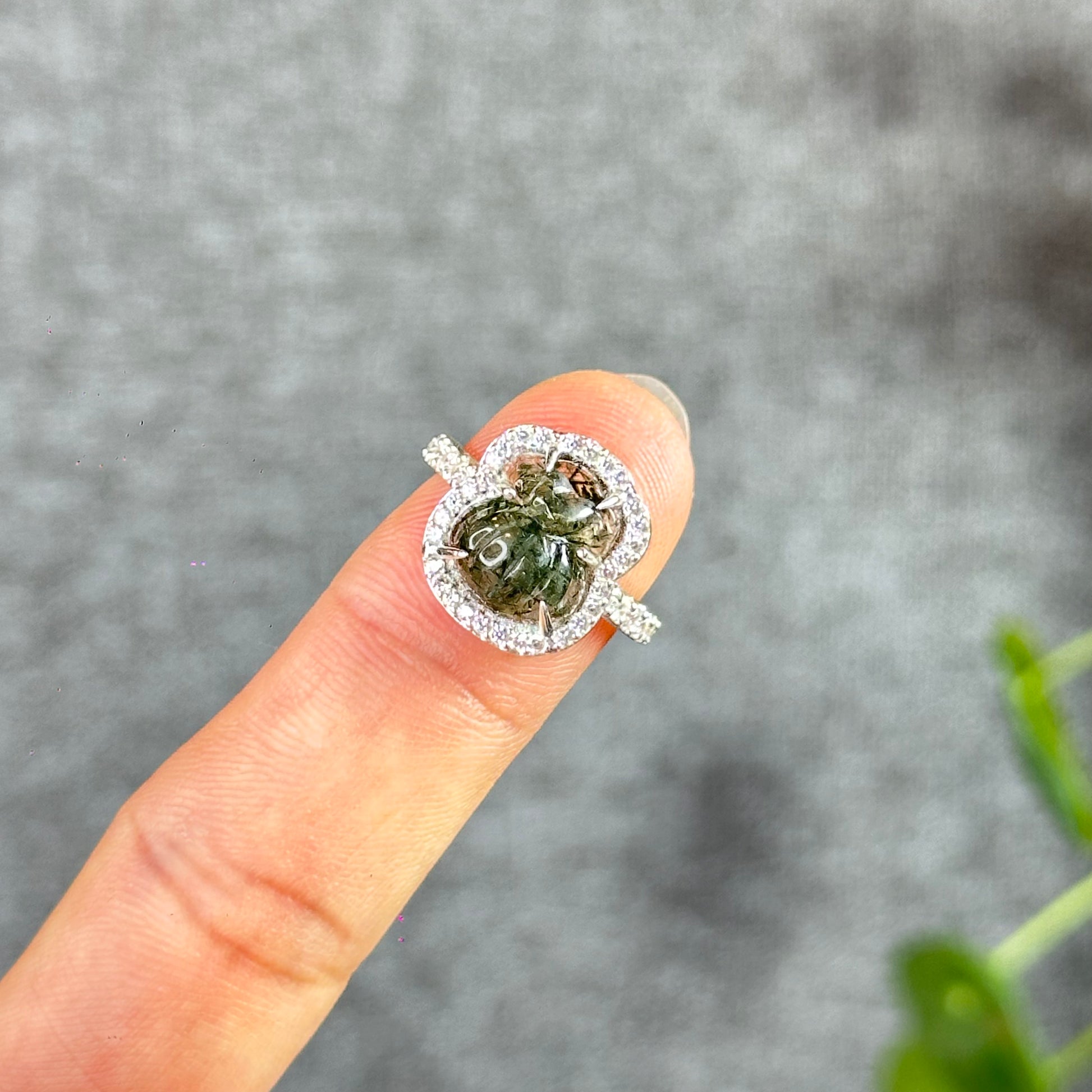 - Natural Green Rutilated Quartz Money Bag Ring in Silver with White Stone Setting Size 1.65