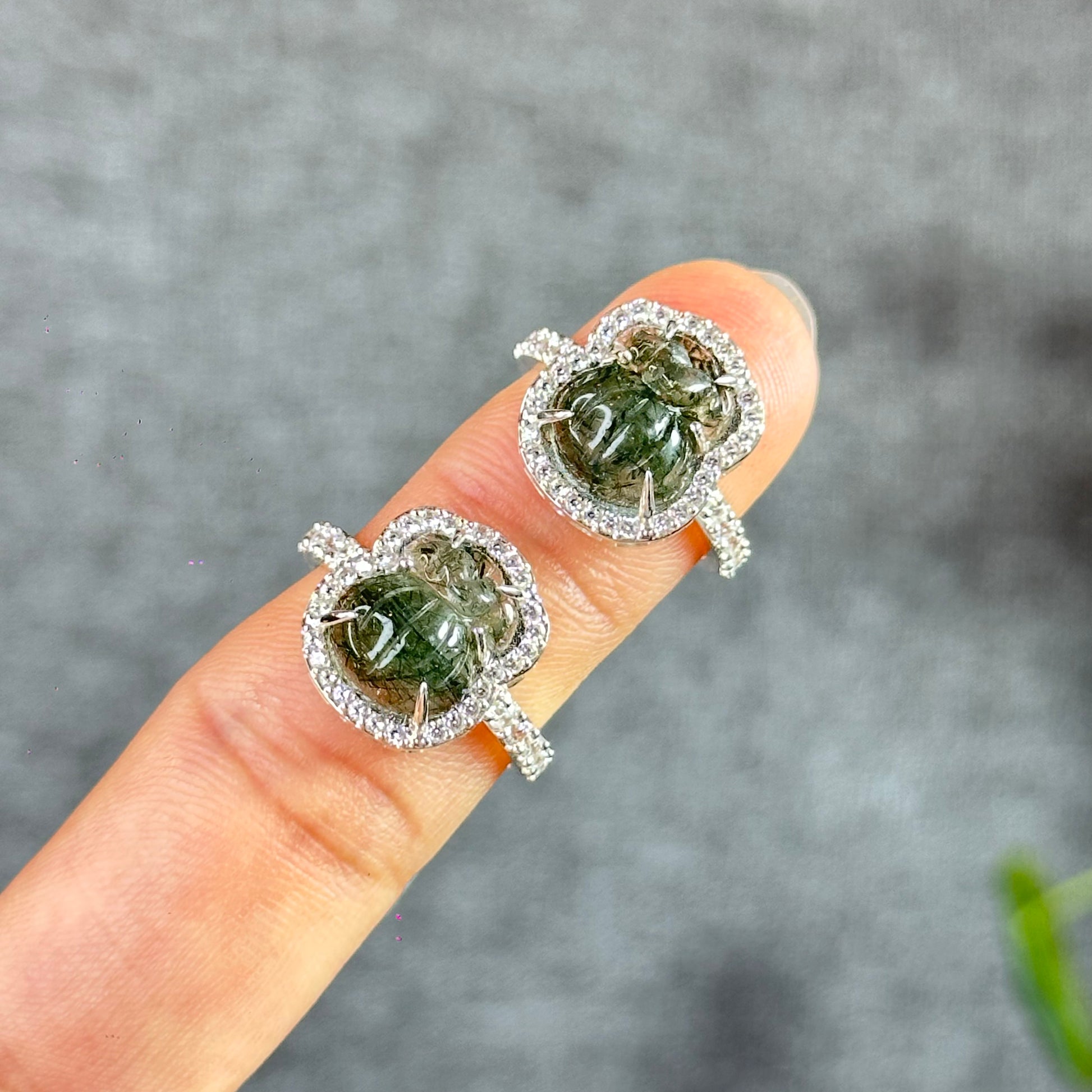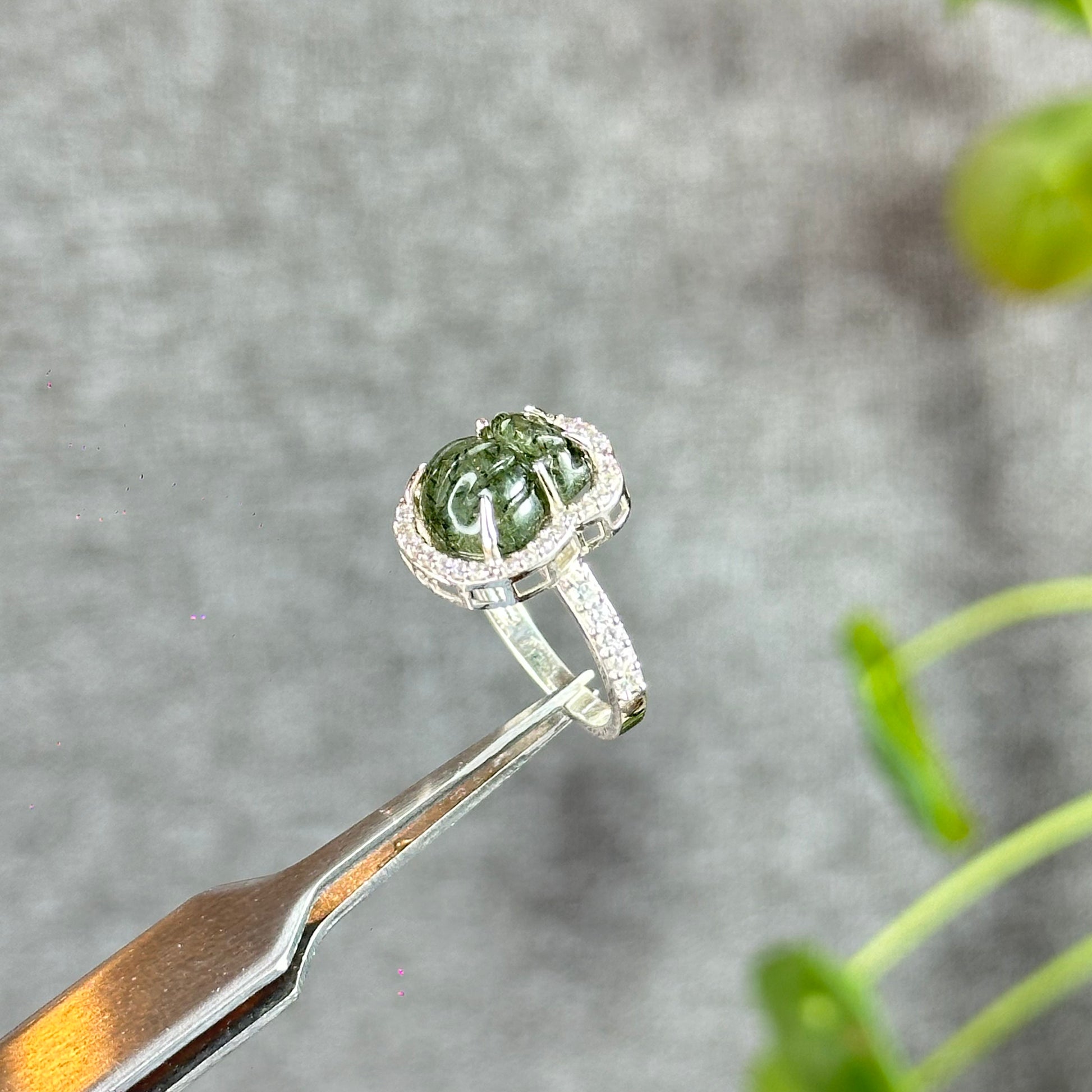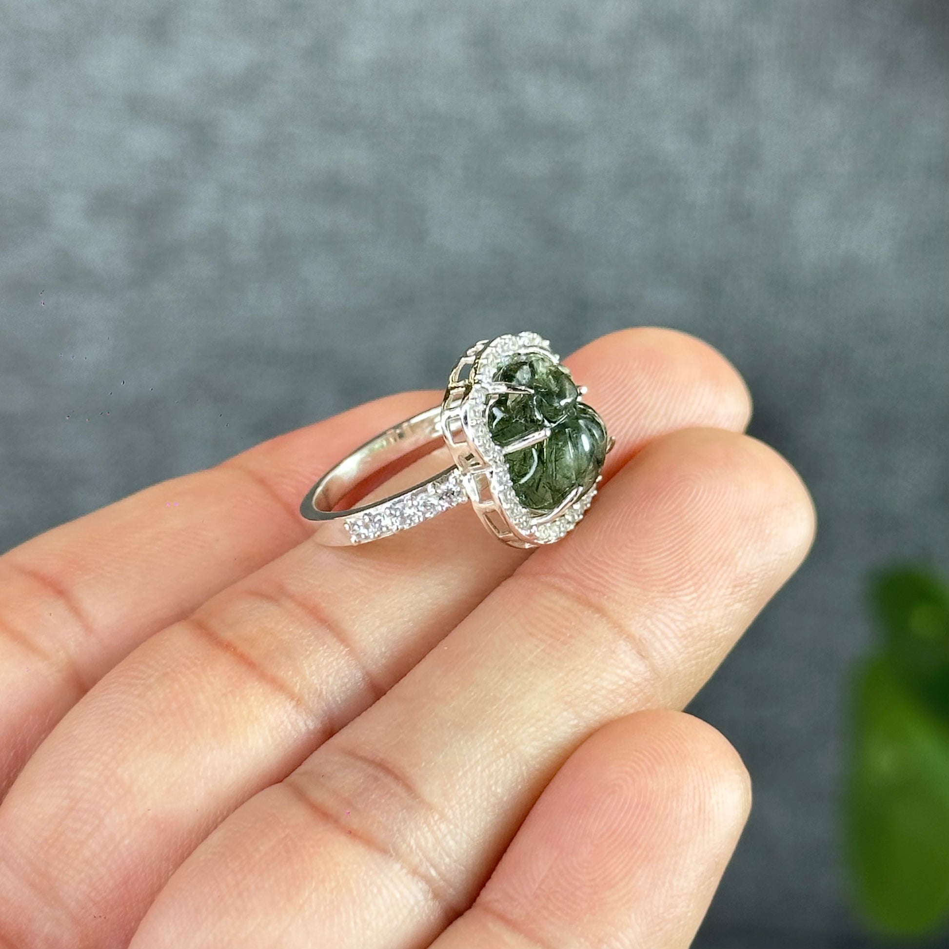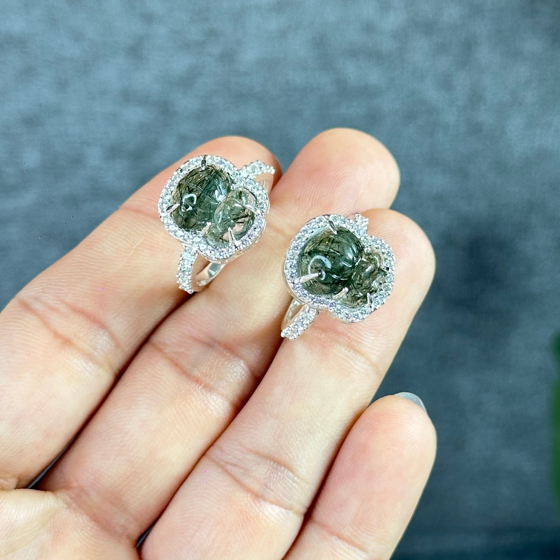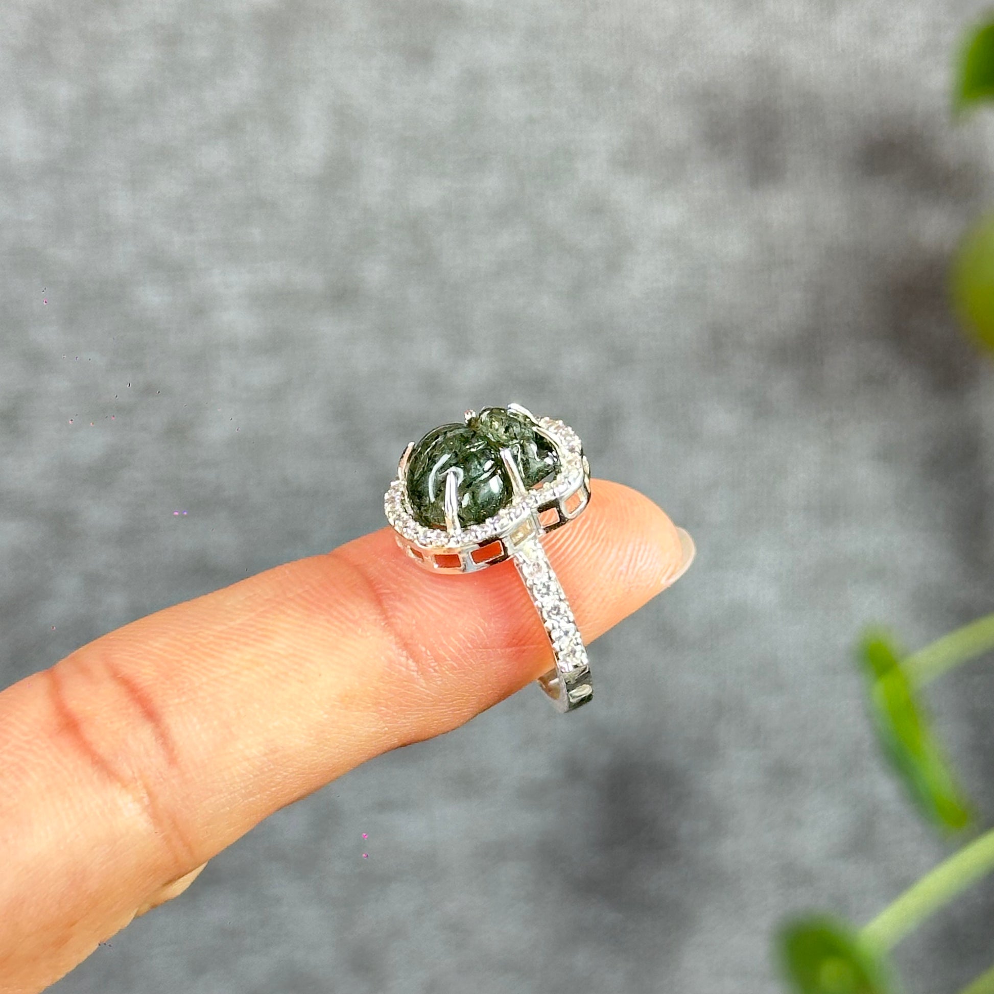 - Natural Green Rutilated Quartz Money Bag Ring in Silver with White Stone Setting Size 1.65