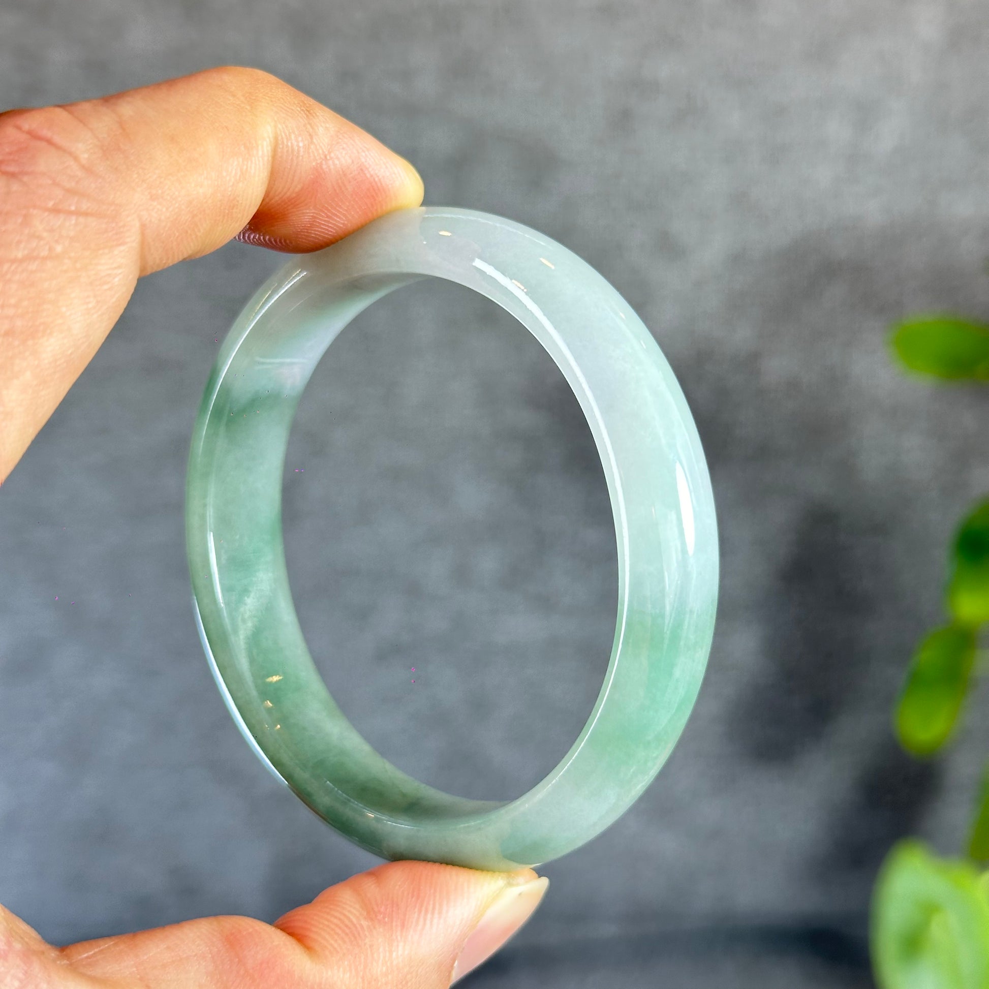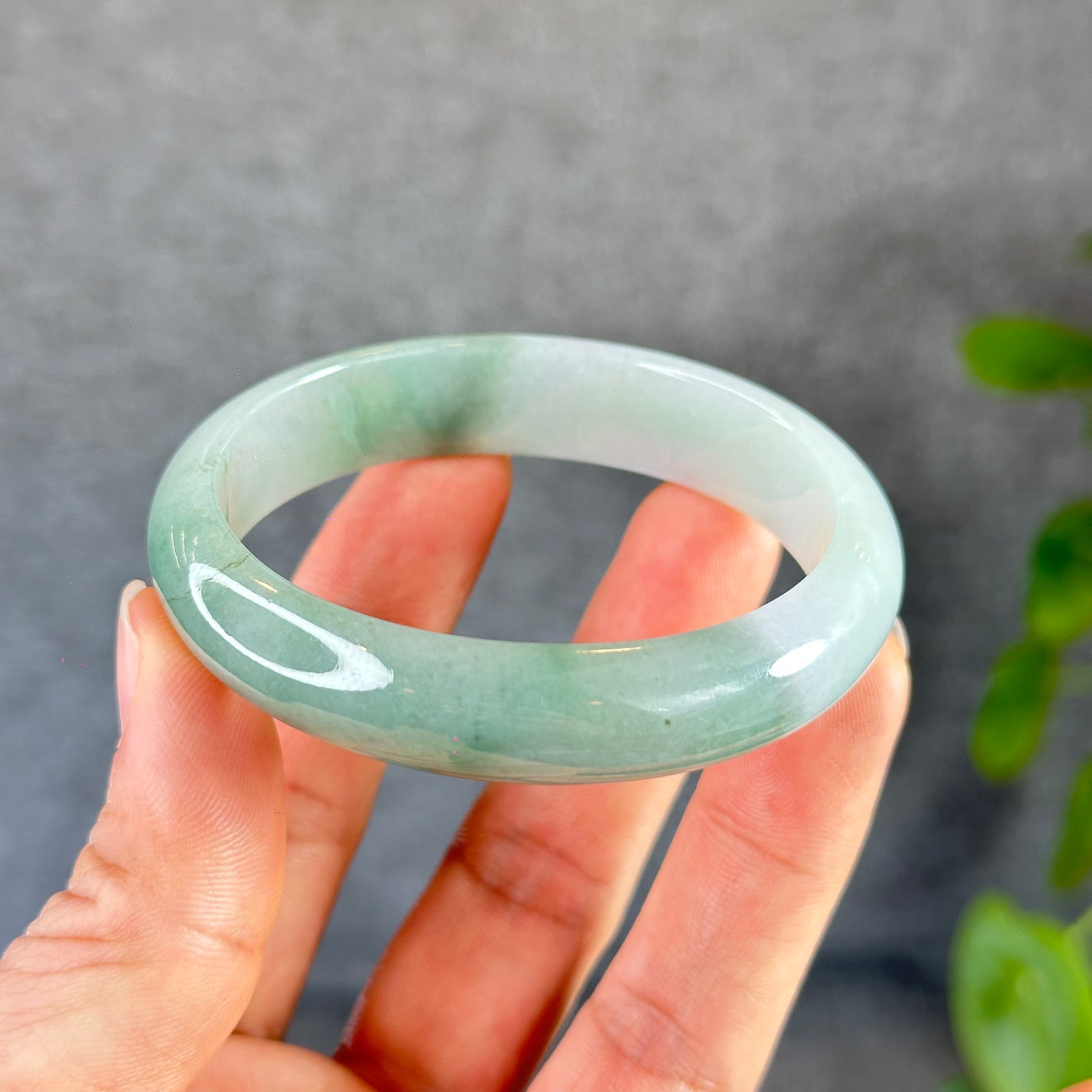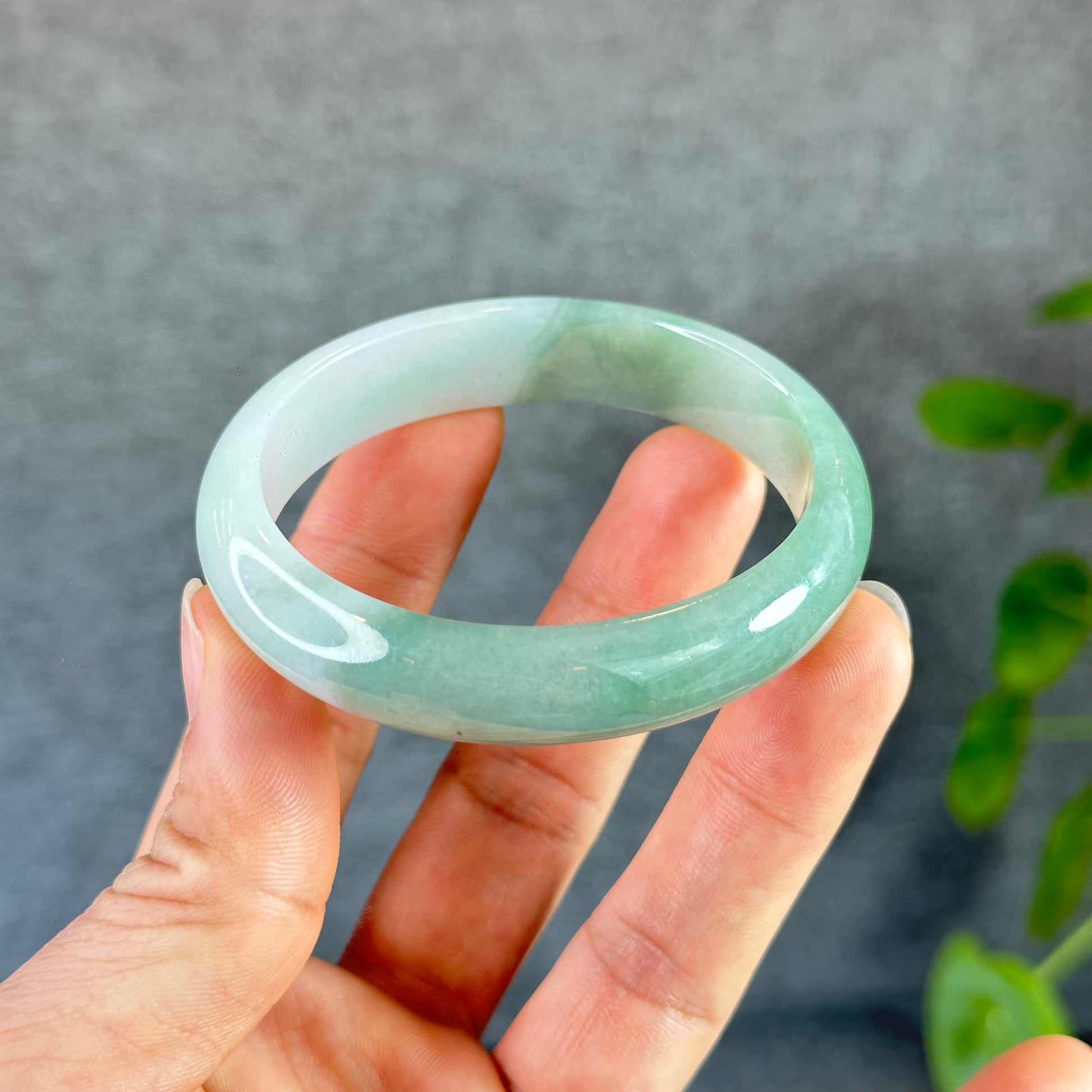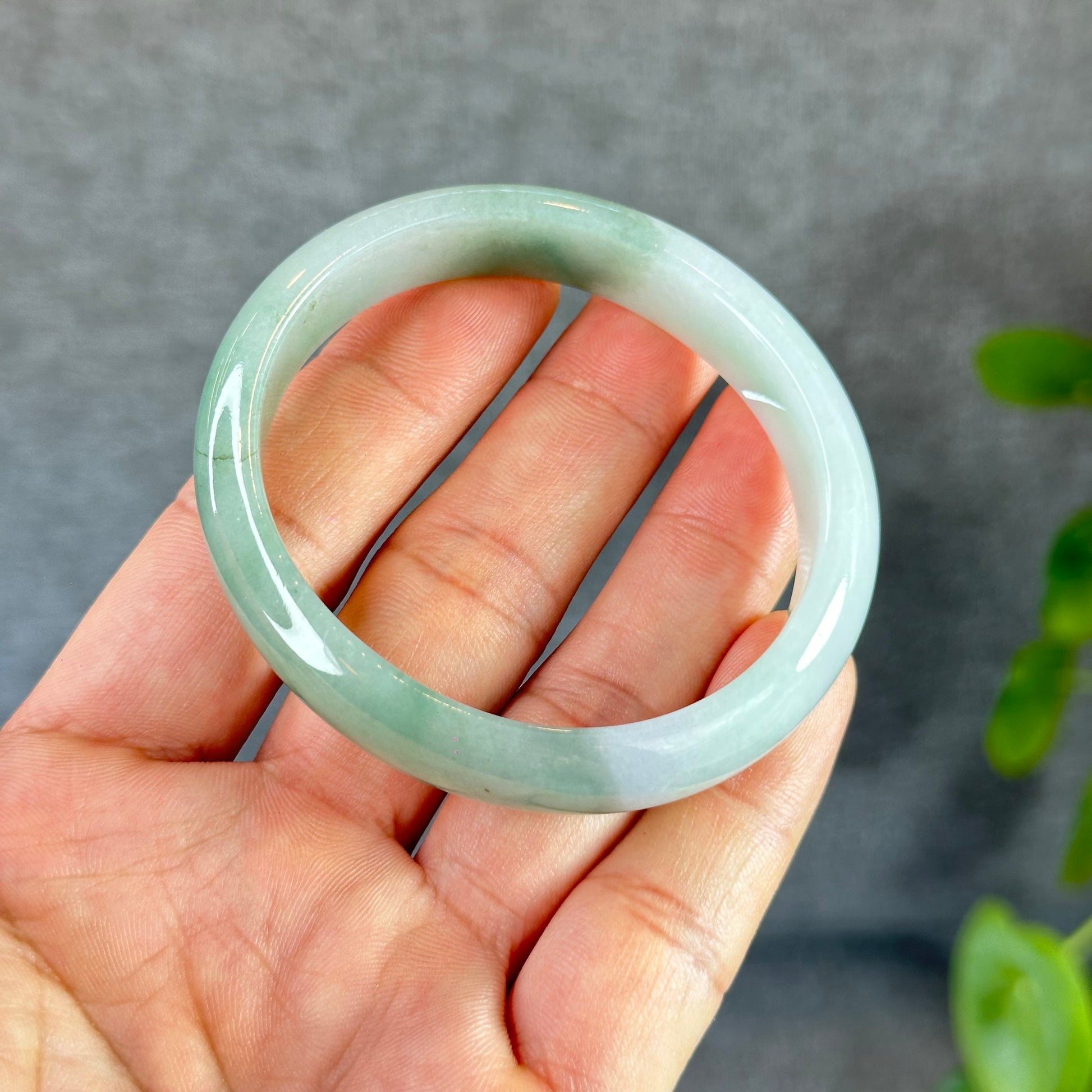 Moss Green Ivory White Natural Jadeite Jade Bangle Oval Leaf Style Size 55 mm