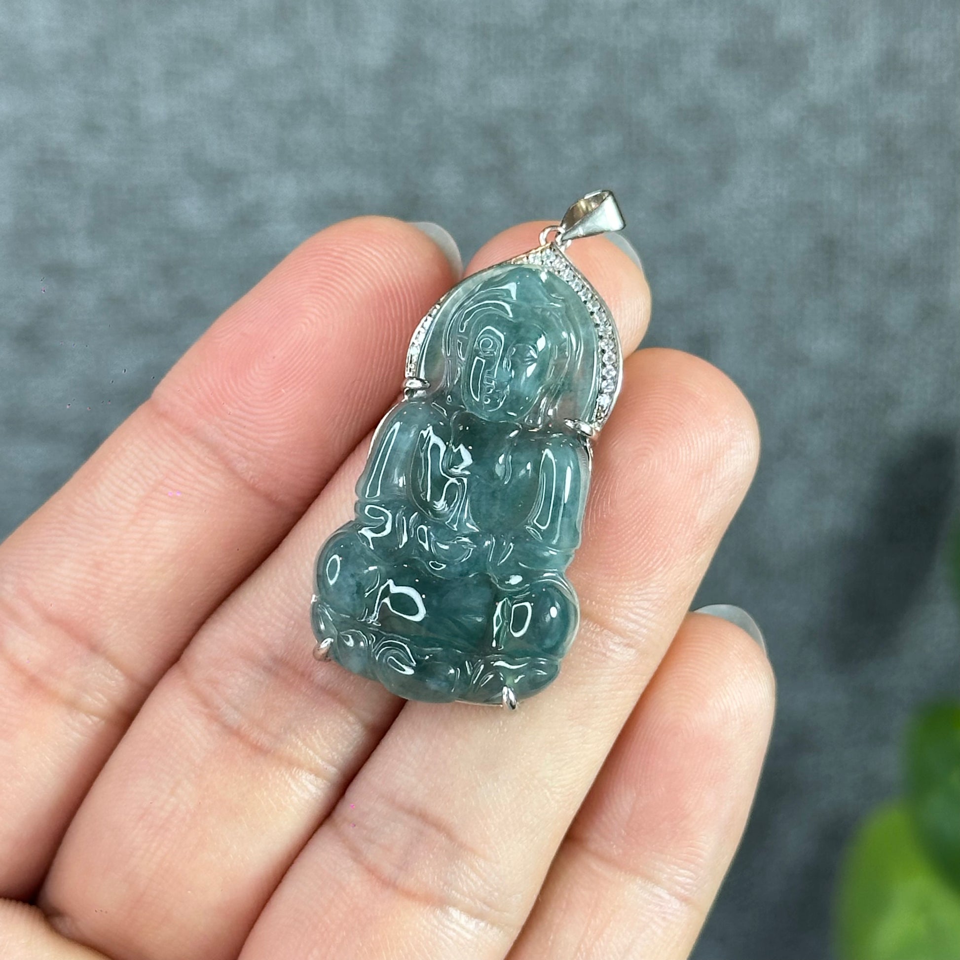 - Icy Water Green Quan The Am Buddha Jadeite Jade with White Stone Aura Pendant in Silver Simple setting