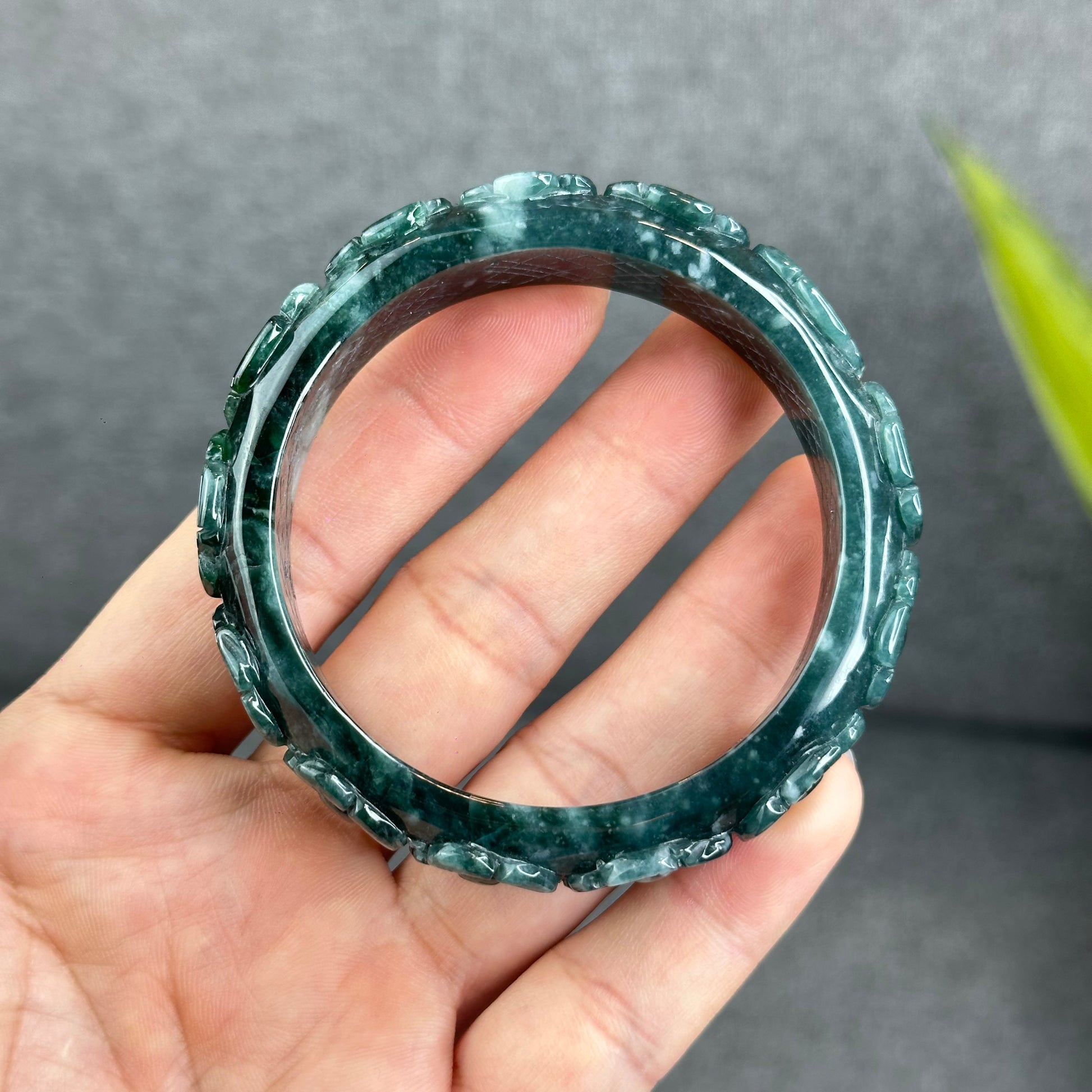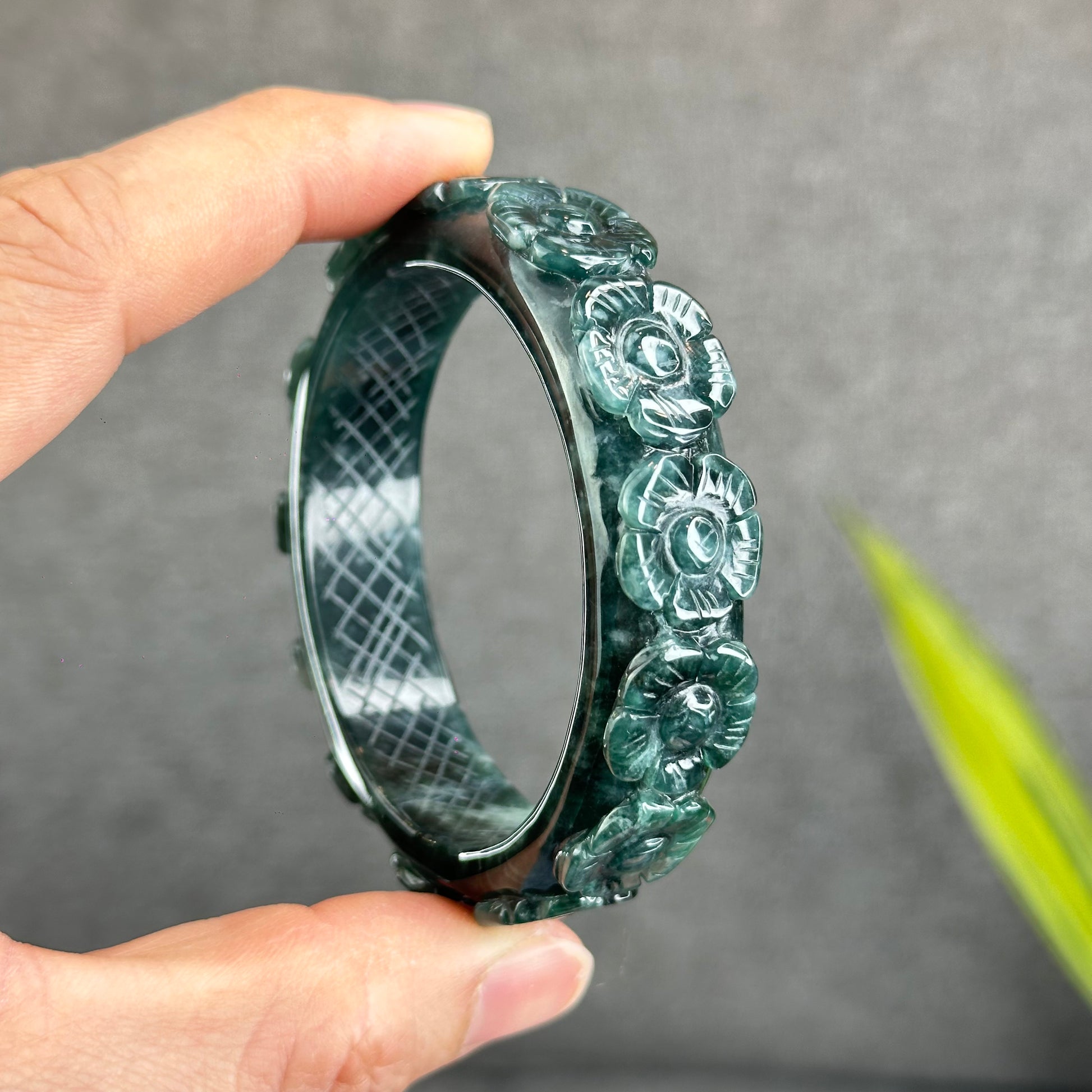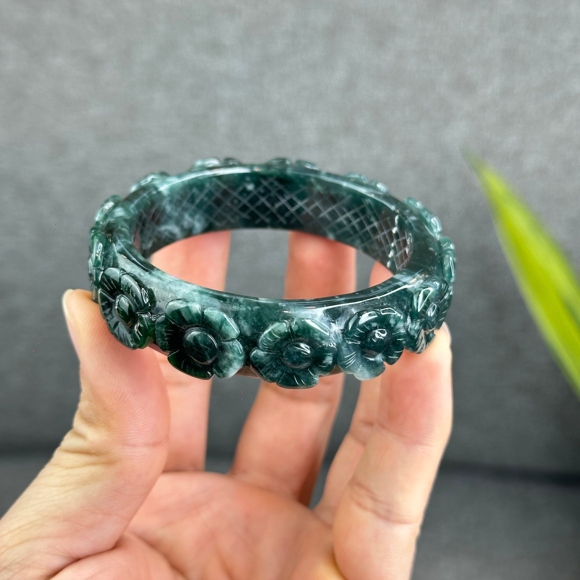 Natural Water Green Floating Flower Carving Jadeite Jade Banlge Square Style Size 55 mm
