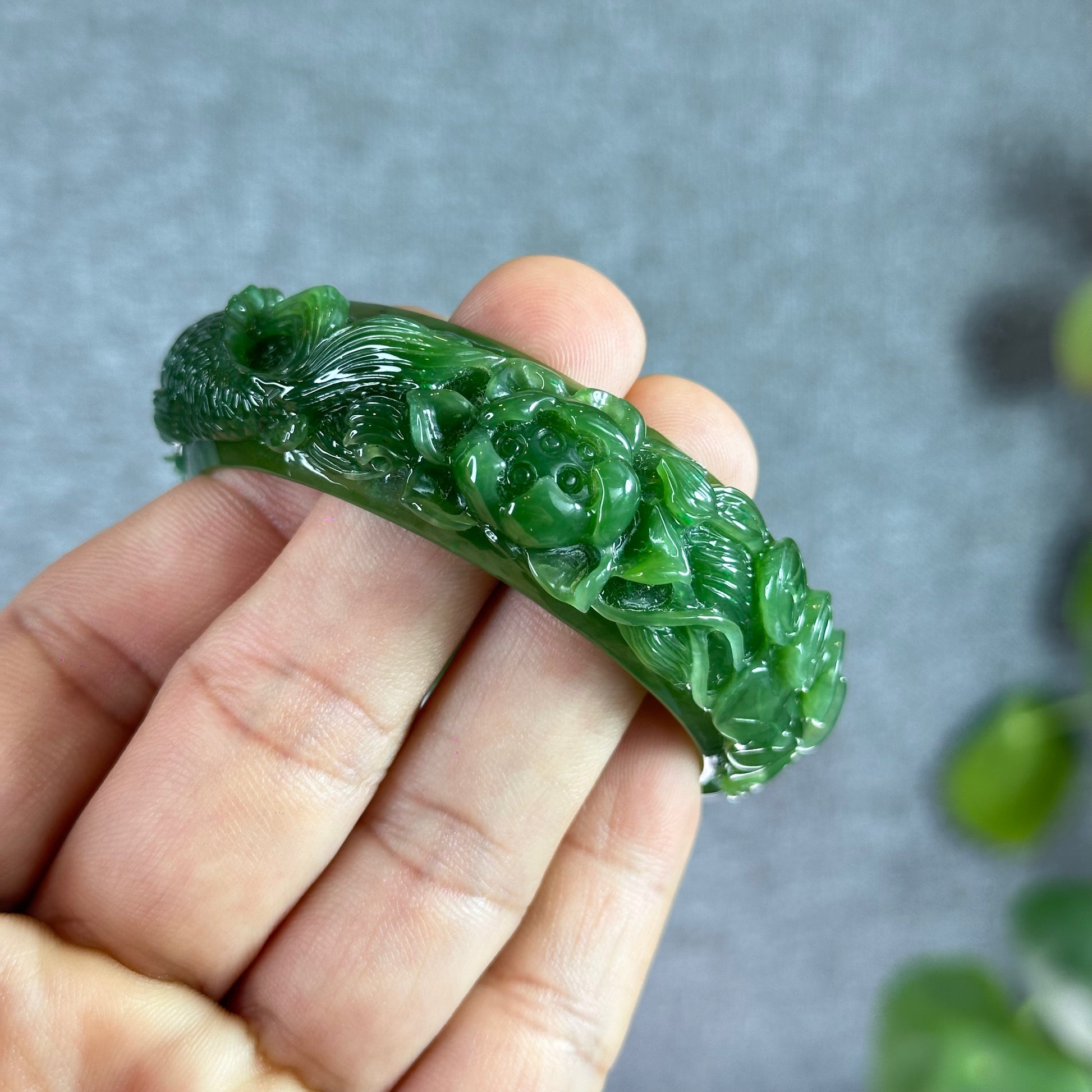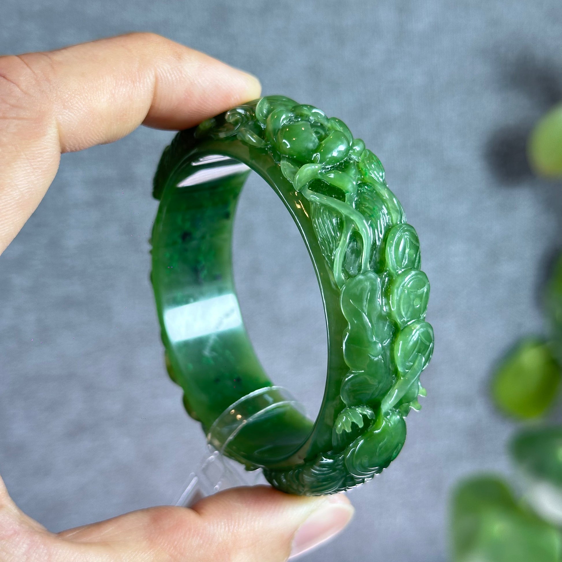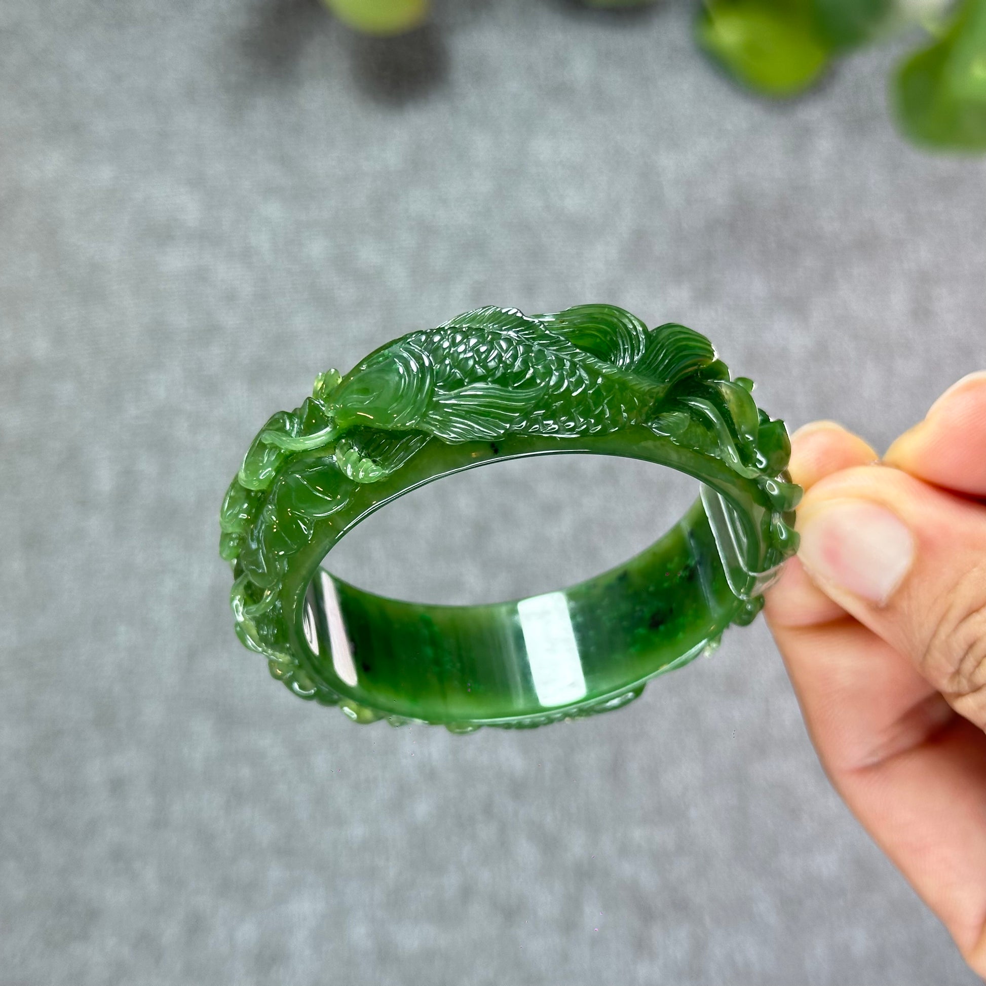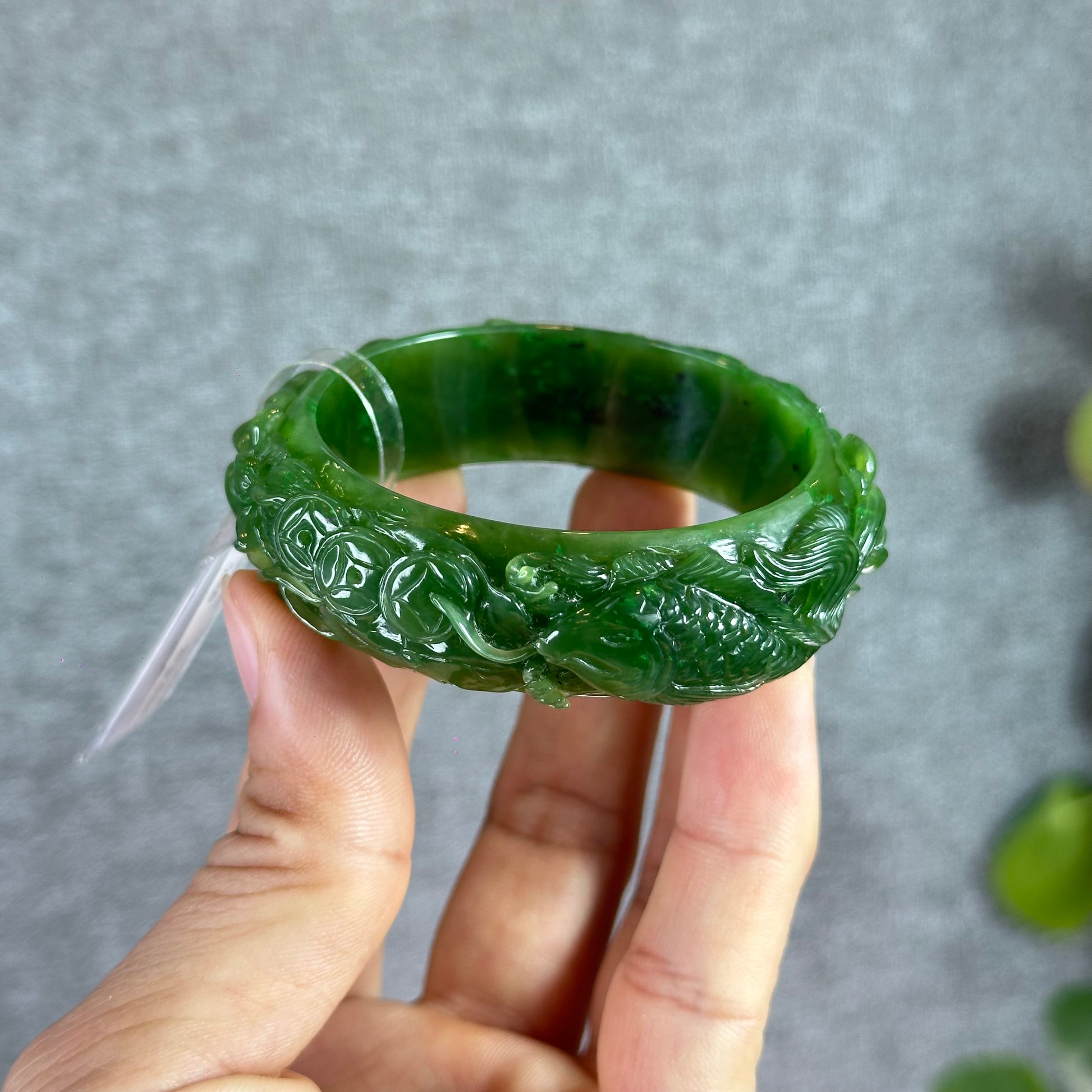 Lotus Fish Feng Shui Carved Natural Nephrite Jade VIP Banlge Size 52 mm