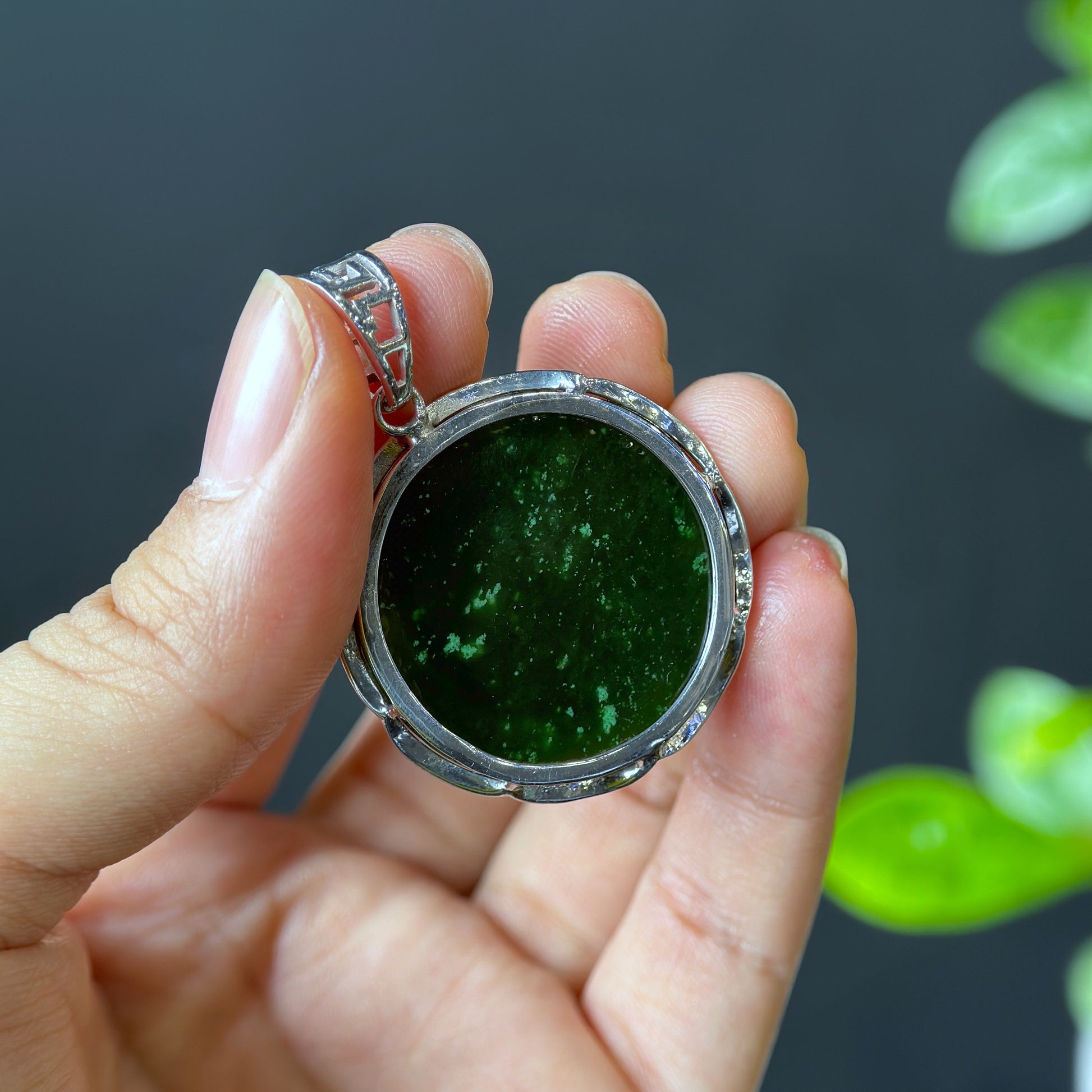 - Feng Shui Pisces Natural Nephrite Jade Pendant in Gold Plated Silver Setting