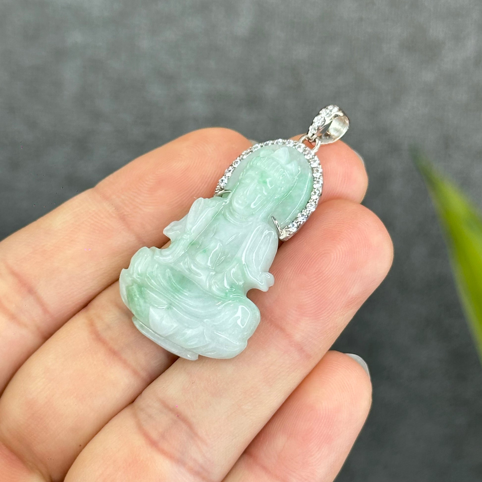 - Natural Jadeite Jade Quan Yin Buddha Pendant with 10k White Gold Setting