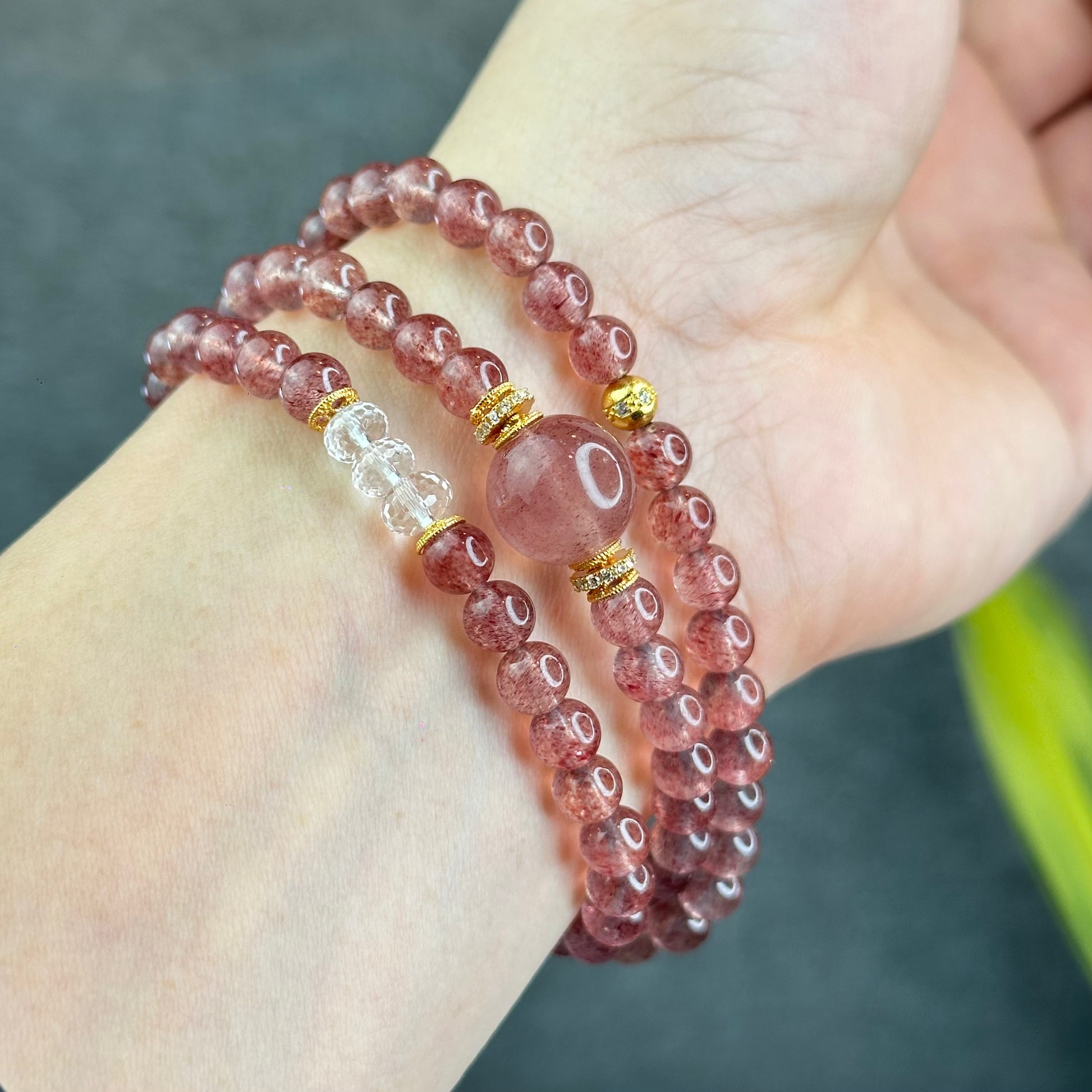 Natural Pink Strawberry Quartz Triple Wrap Bracelet Size 6 mm