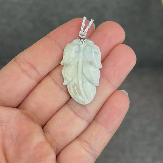 - Natural Floral Light Green Leaf Jadeite Jade Pendant White 10k Gold with White Stone Hook