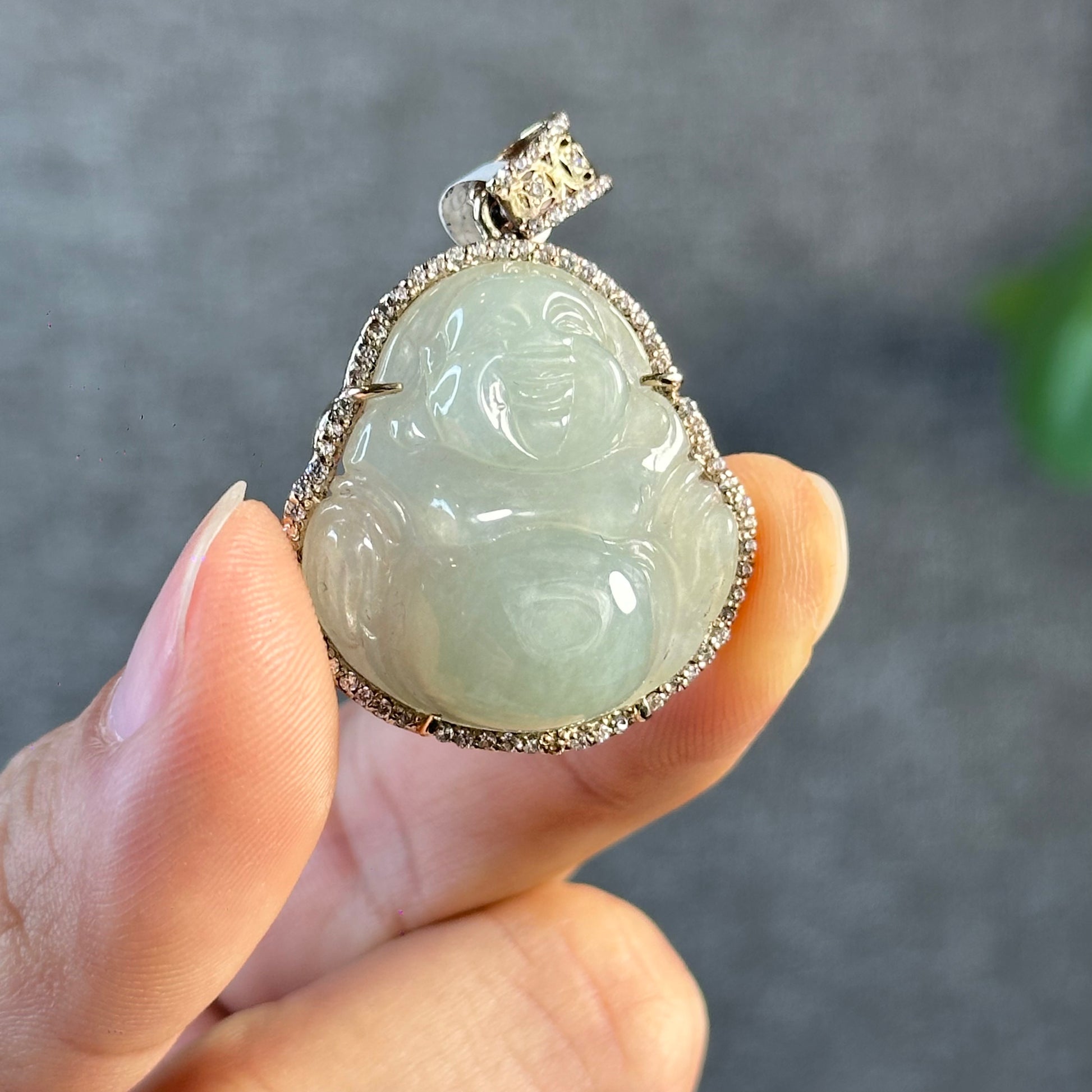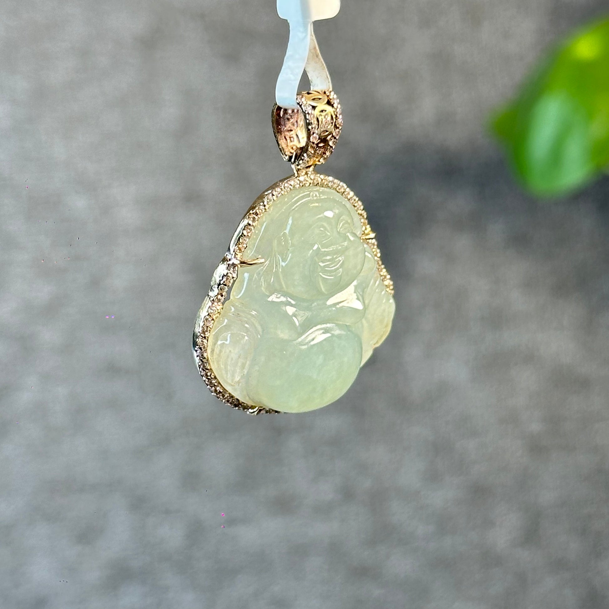 - Happy Buddha Water Green Natural Jadeite Jade Pendant in a 10k Yellow Gold with White Stone Surrounding Setting