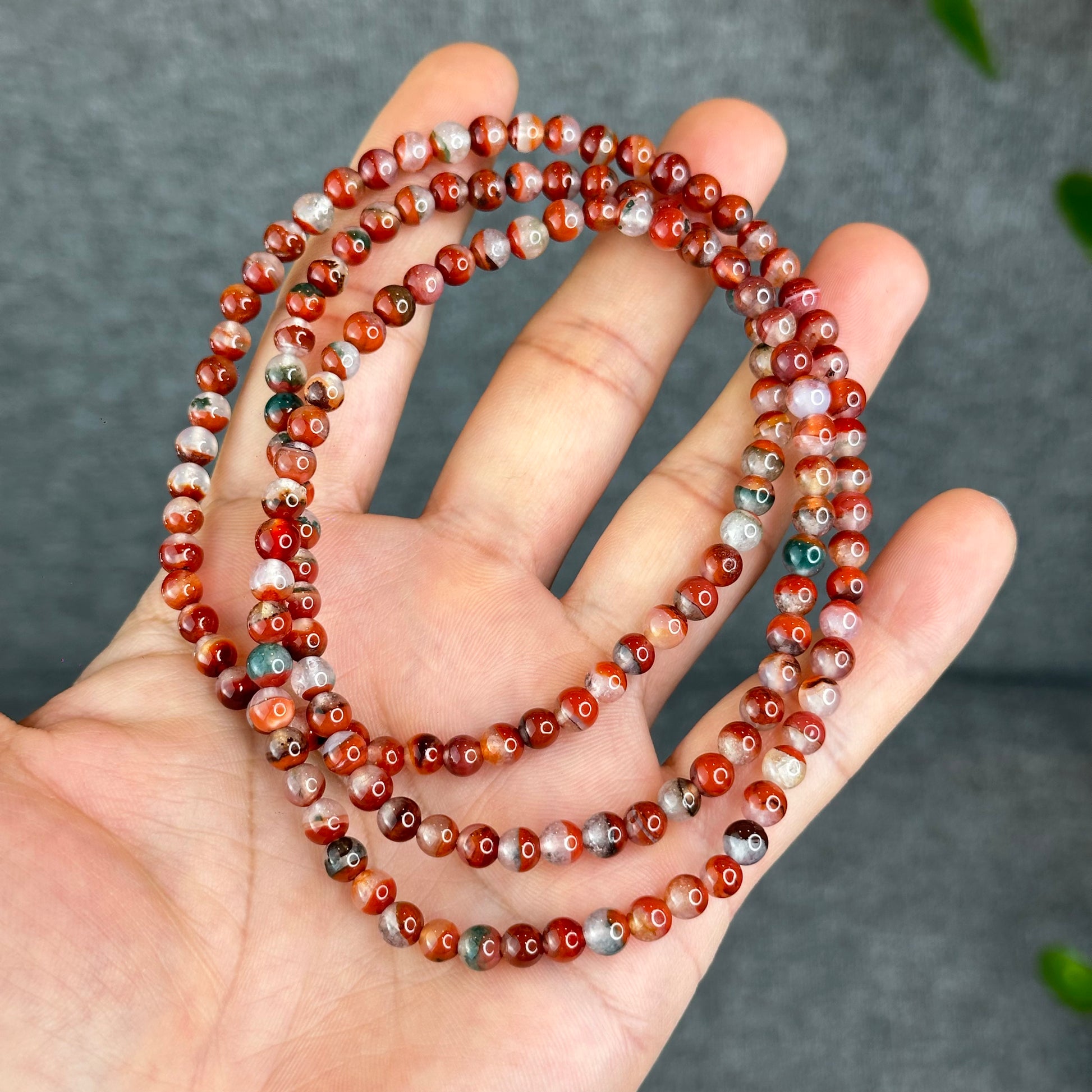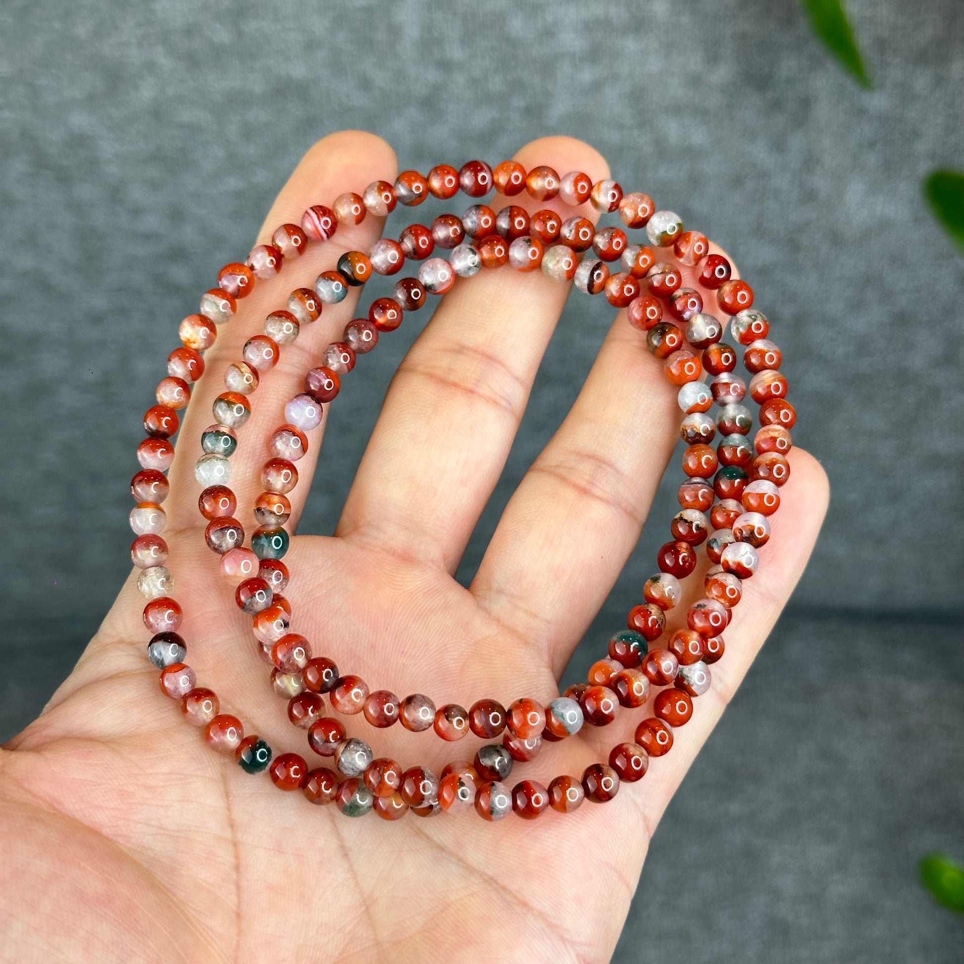 Natural Half Bowl Mixed Moss Green Nan Hong Agate VIP Triple Wrap Bracelet Size 5 mm